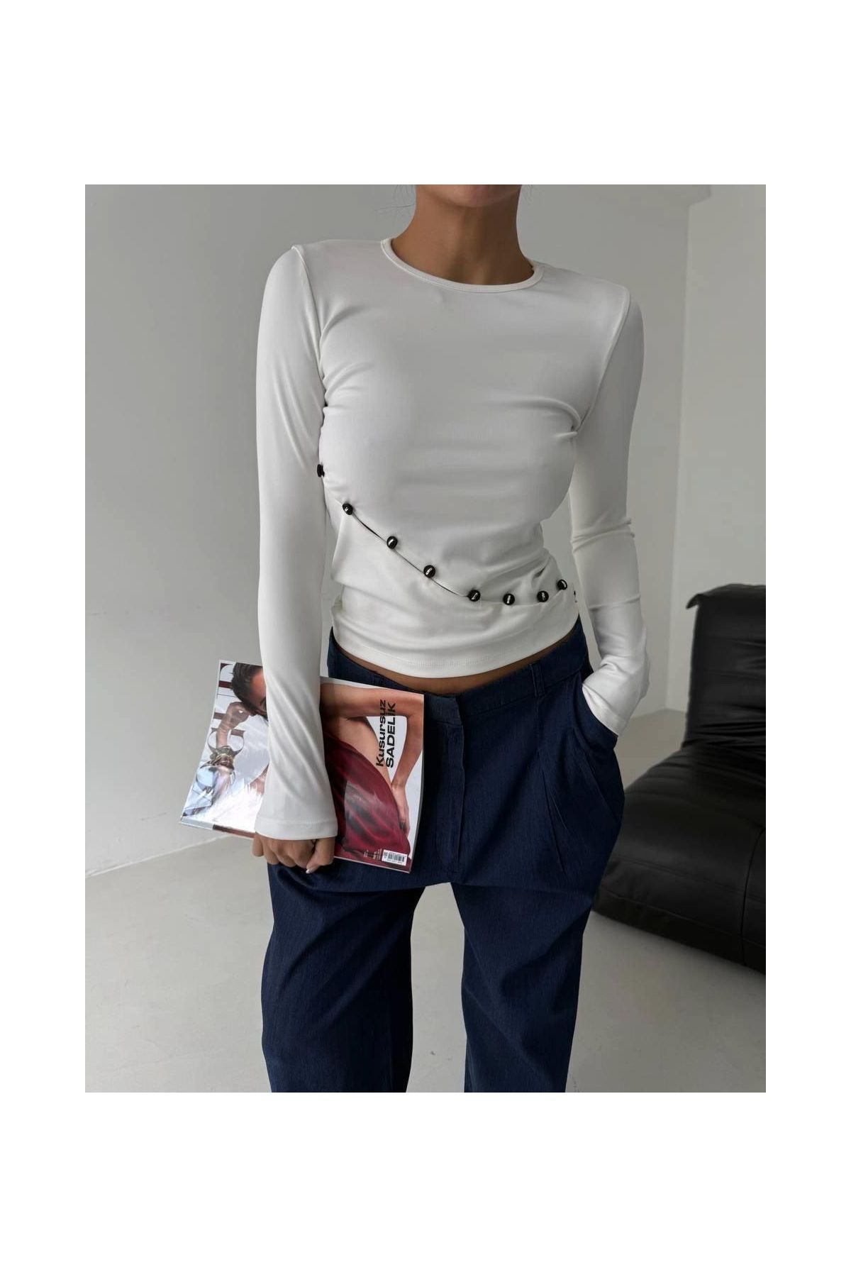 Asimetrik alt detaylı bluz beyaz