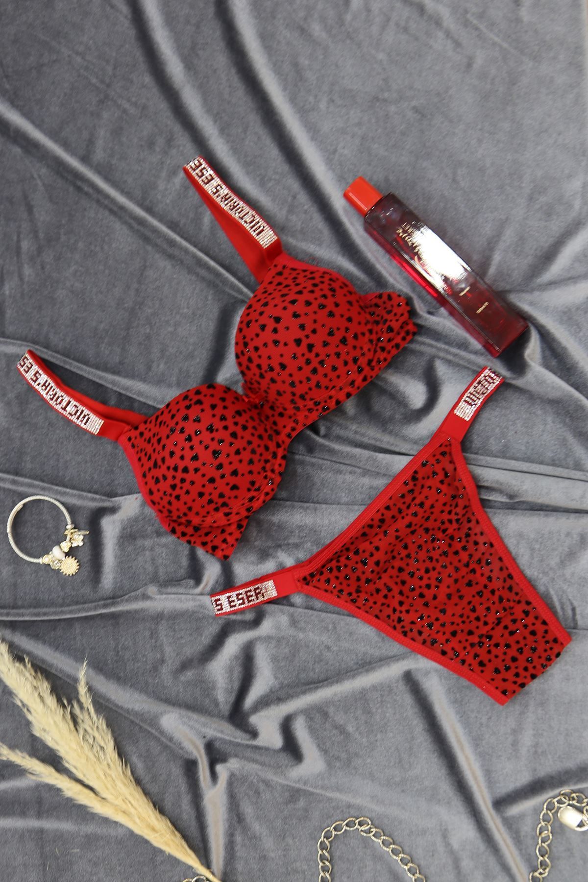 Kalpli Flok Baskılı Sütyen Takım Kırmızı