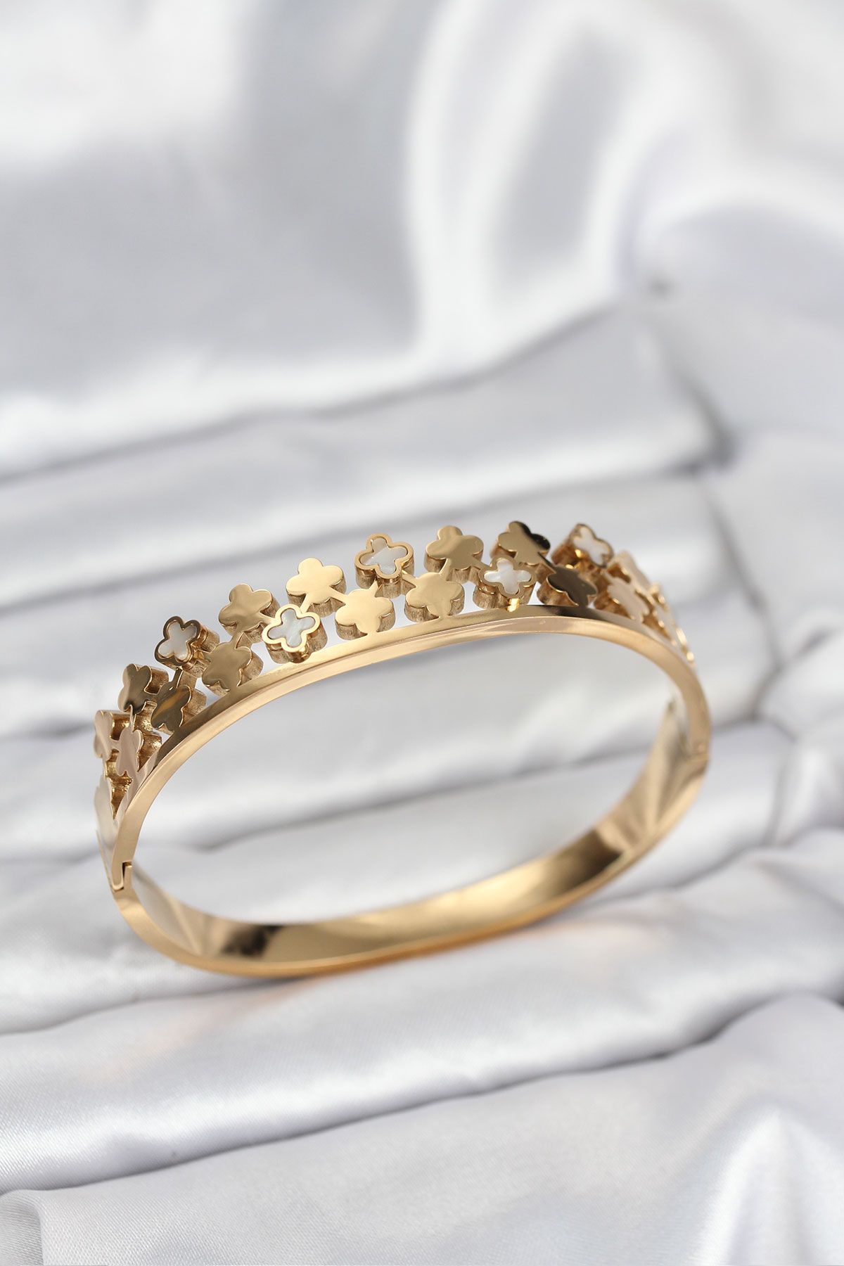 316L Çelik Gold Renk Minimal Yoncalı Kadın Kelepçe Bileklik - TJ-BB8072