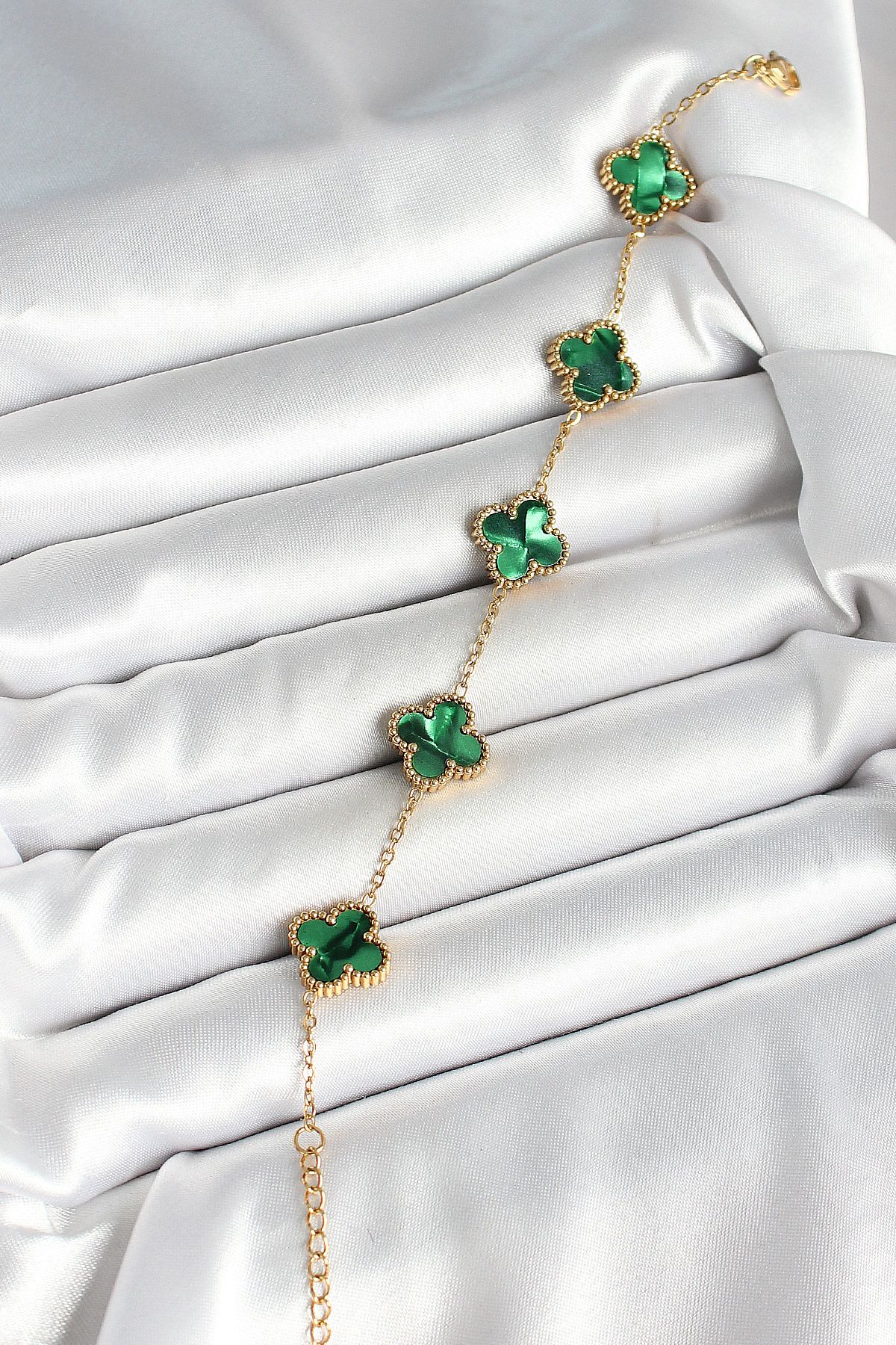 316L Çelik Sedefli Zümrüt Yeşil Gold Renk Yonca Kadın Bileklik - TJ-BB6968
