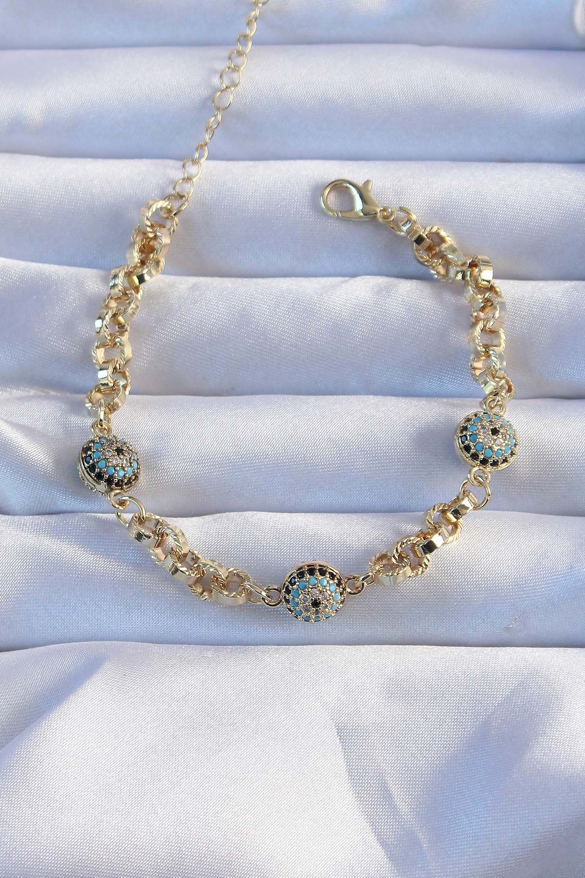 316L Çelik Vip Seri Altın Renk Zirkon Taşlı Nazarlı Bileklik - TJ-BB6393