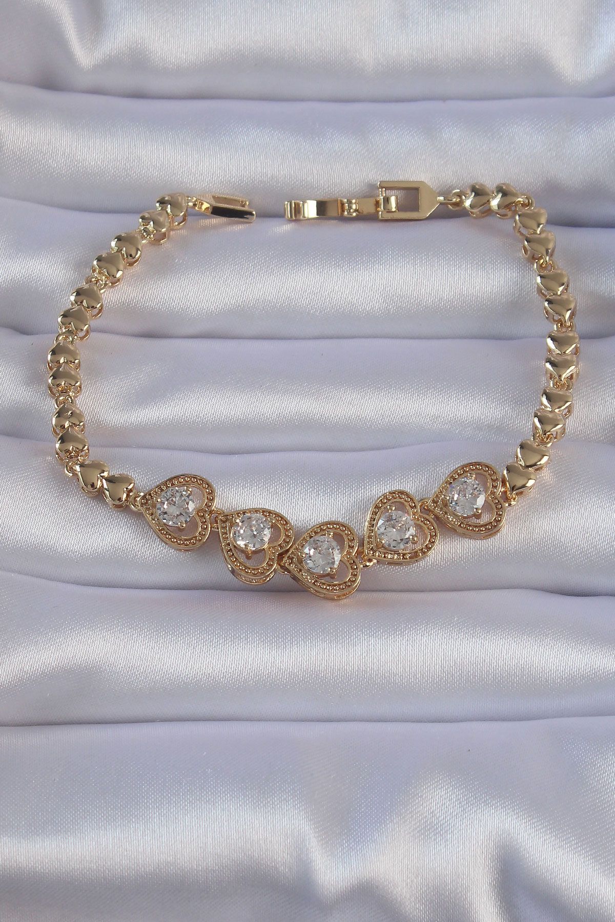 Pirinç Gold Renk İçi Zirkon Taşlı Kalp Figürlü Bileklik - TJ-BB6140