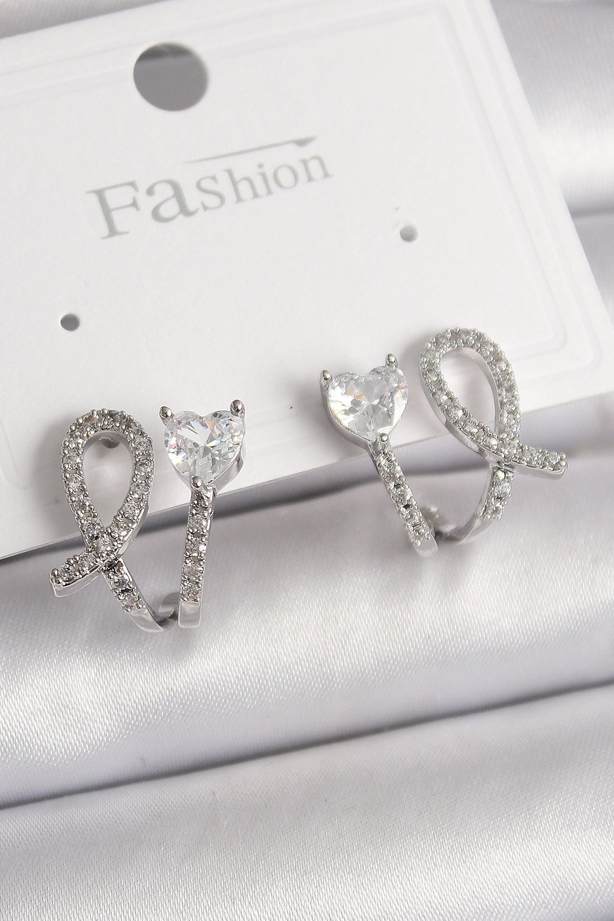 Pirinç Gümüş Renk Düğüm Model Zirkon Taşlı Kalp Detay Kadın Küpe - TJ-BKP9910