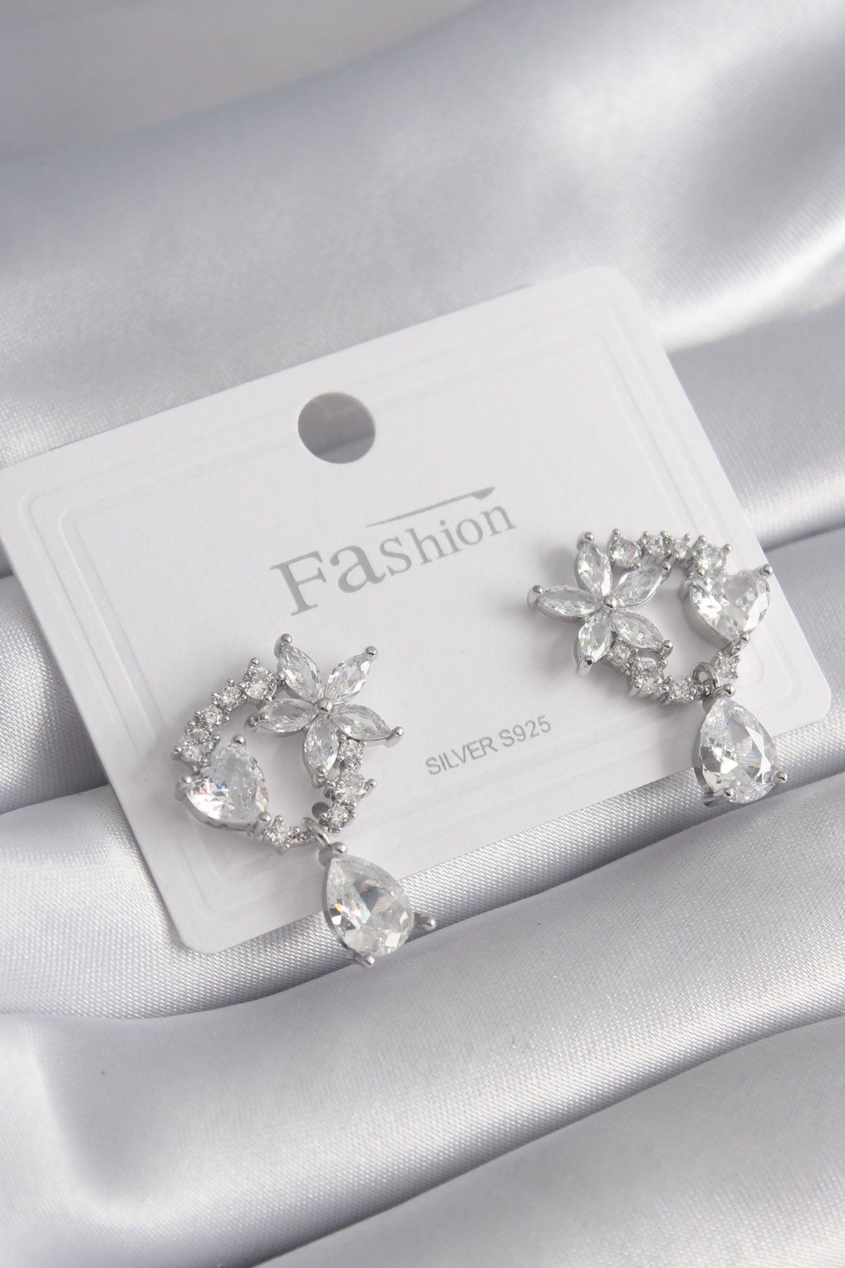 Pirinç Gümüş Renk Zirkon Taşlı Çiçek Model Sallantı Detay Kadın Küpe - TJ-BKP8453