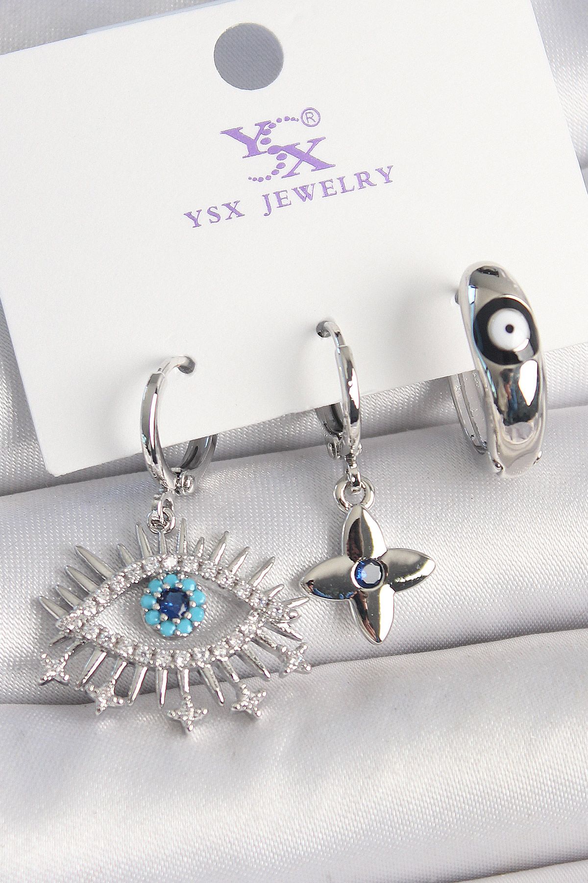 Pirinç Gümüş Renk Zirkon Taşlı Göz Model Nazar Boncuk Detay 3'Lü Kadın Kombin Küpe - TJ-BKP10440
