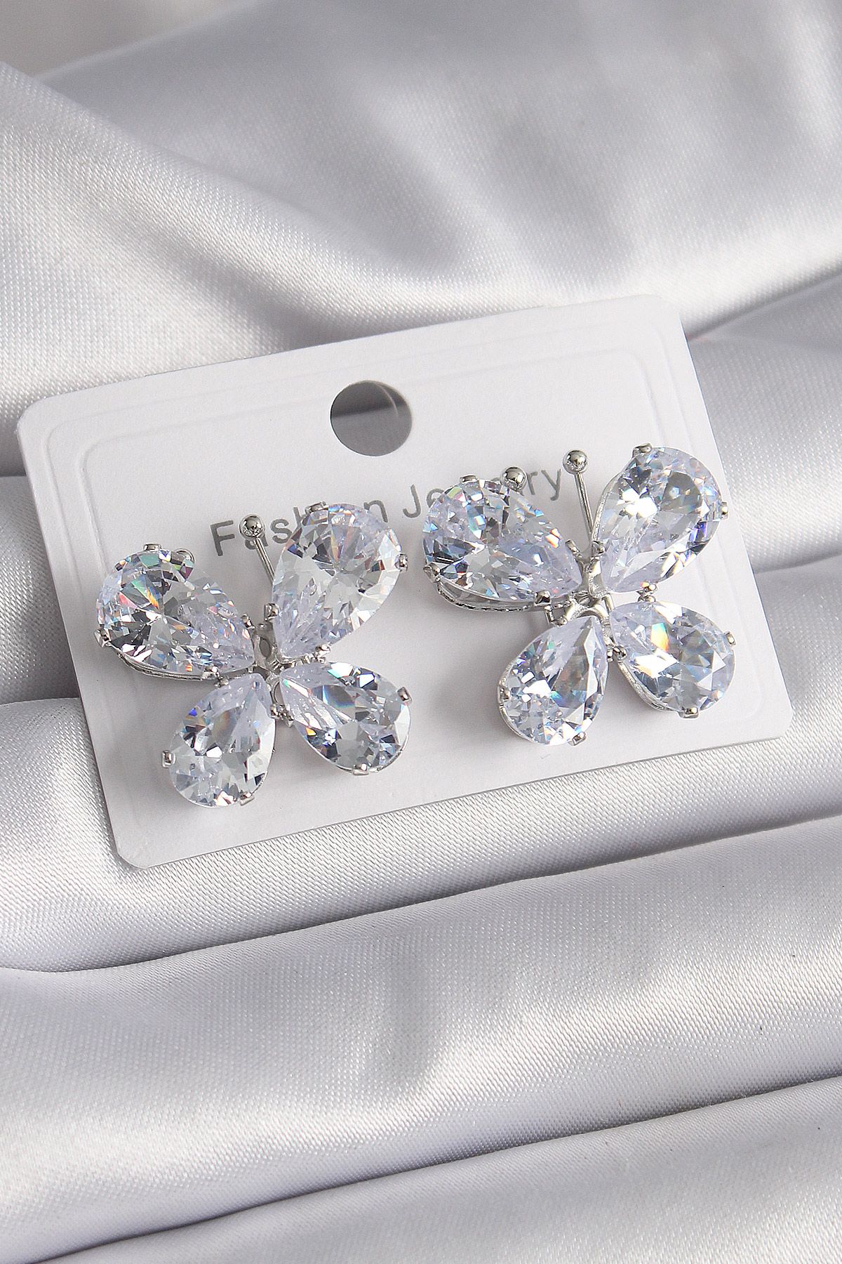 Pirinç Gümüş Renk Zirkon Taşlı Kelebek Model Kadın Küpe - TJ-BKP9613