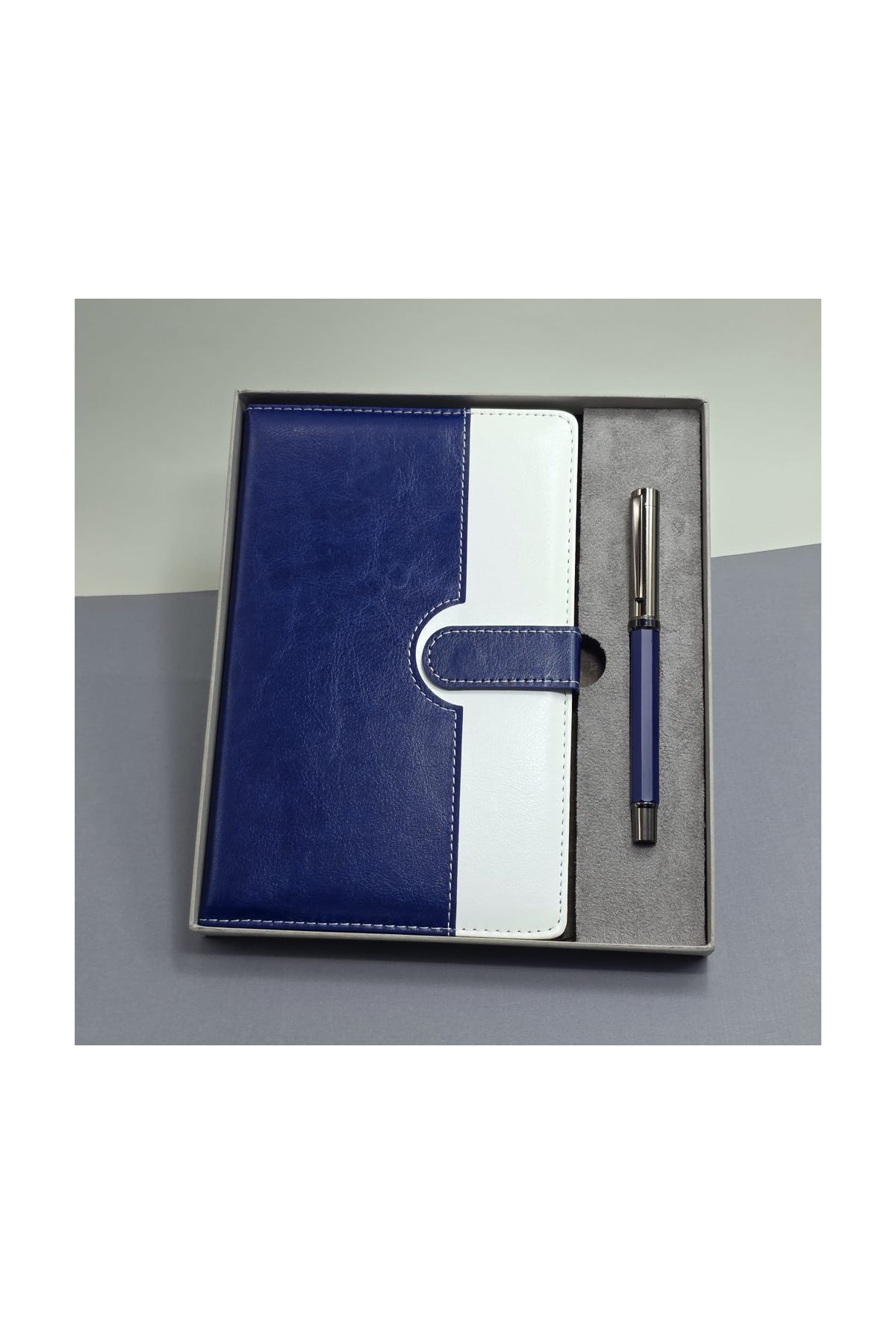 Mavi Beyaz Deri Kapaklı Defter Ve Metal Kalem Set
