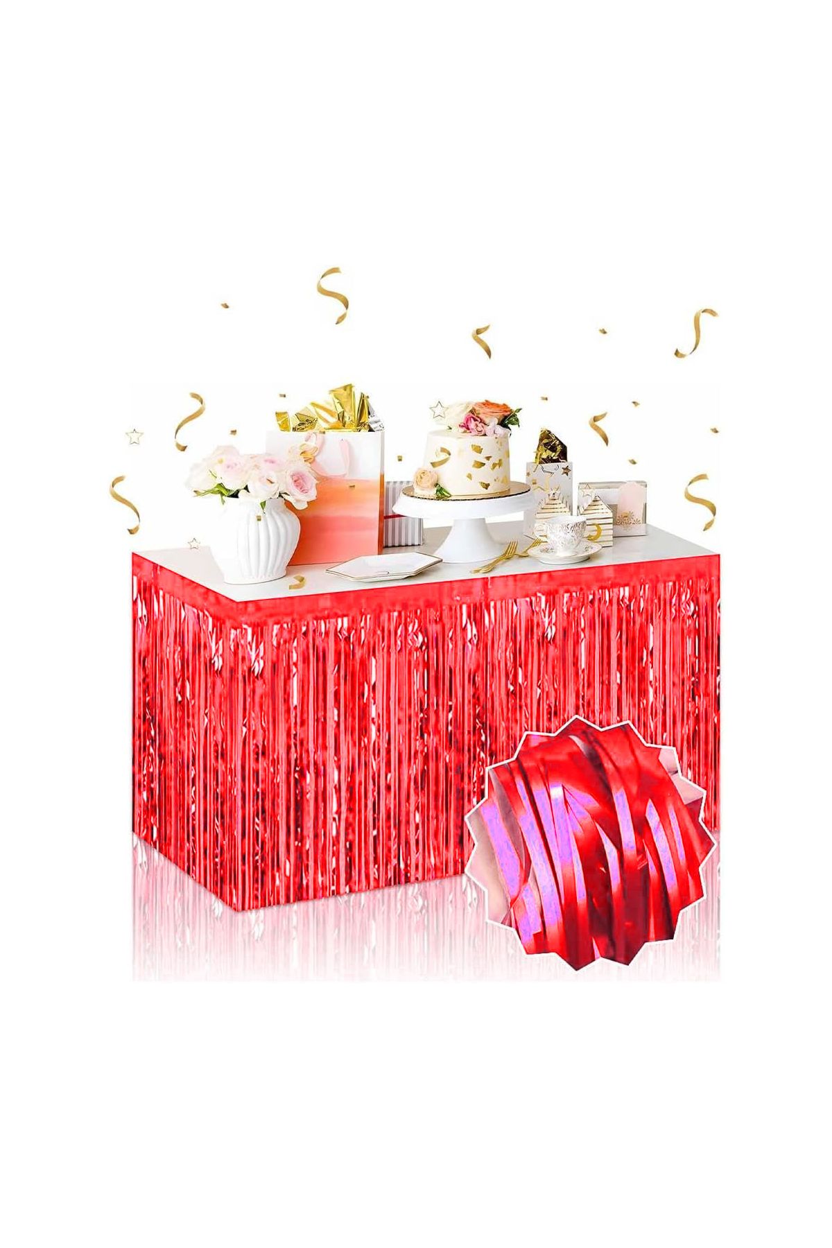 Kendinden Yapışkanlı Kırmızı Metalize Püsküllü Masa Eteği – 75 x 275 cm Parti Süslemesi