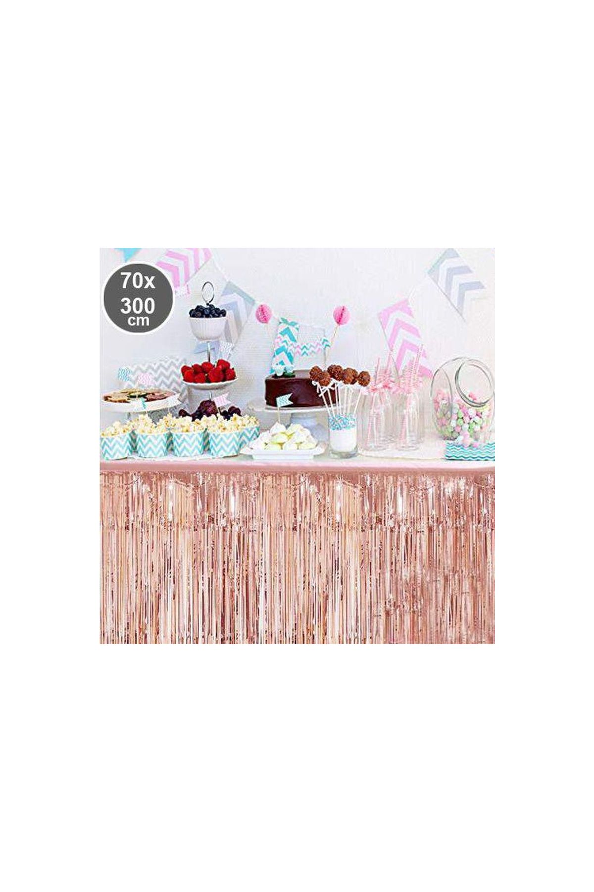 Püsküllü Işıltılı Metalize Rose Renk Masa Eteği 70x300 cm
