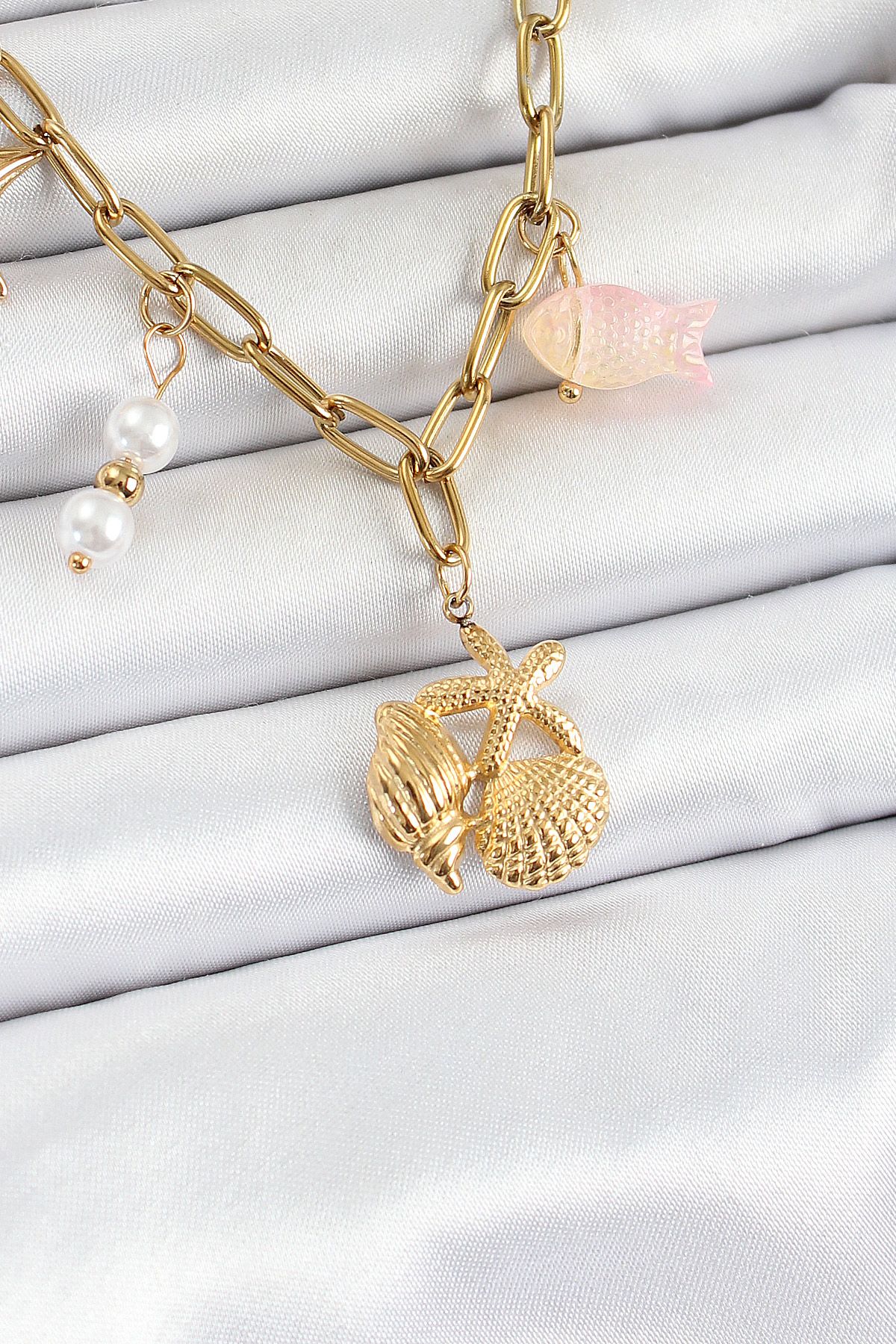 316L Çelik Gold Renk Deniz Yıldızı ve Deniz Kabuğu Konsept Kadın Kolye - TJ-BKO10294