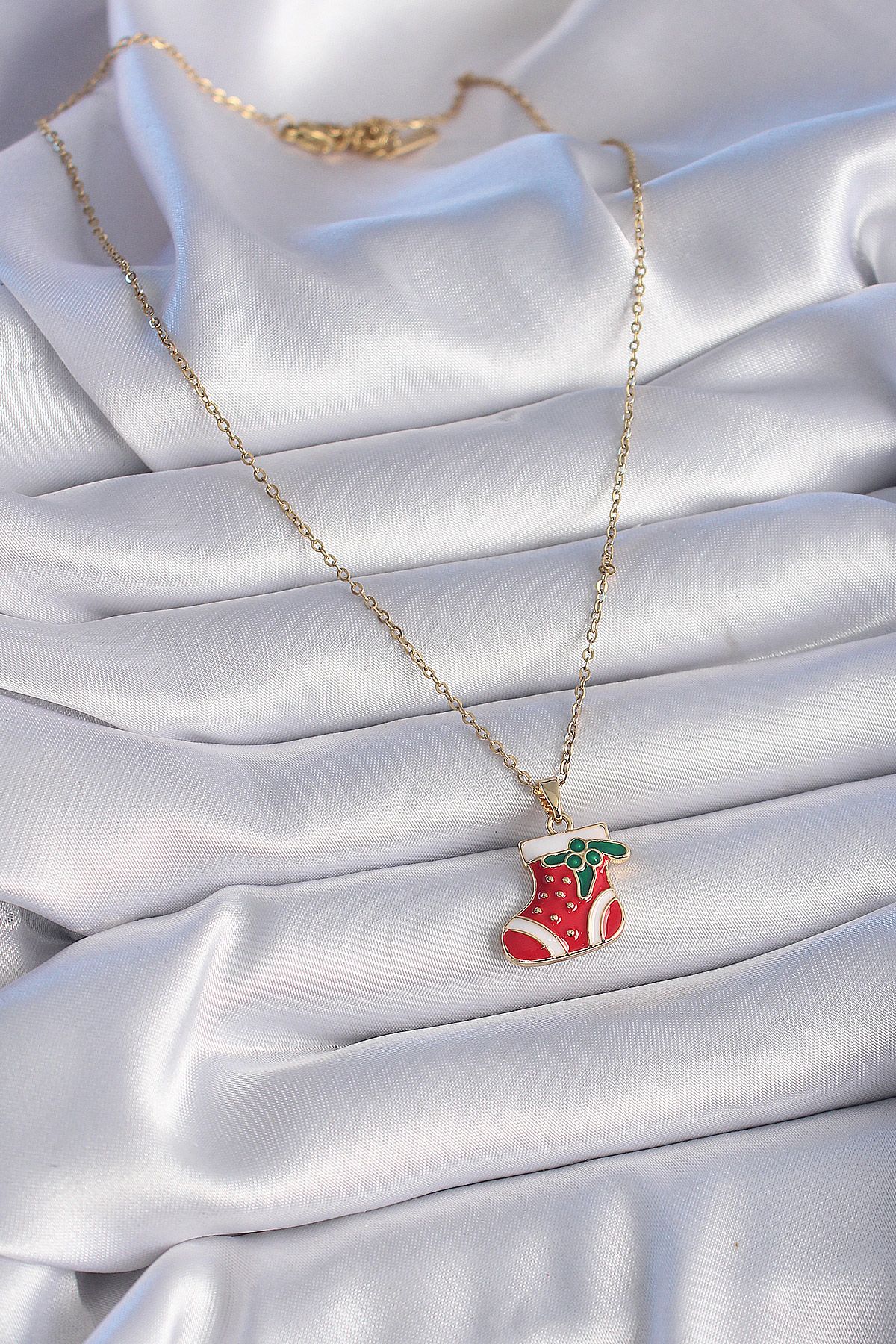 316L Çelik Gold Renk Zincir Kırmızı Yılbaşı Çorabı Figür Kadın Kolye - TJ-BKO9444