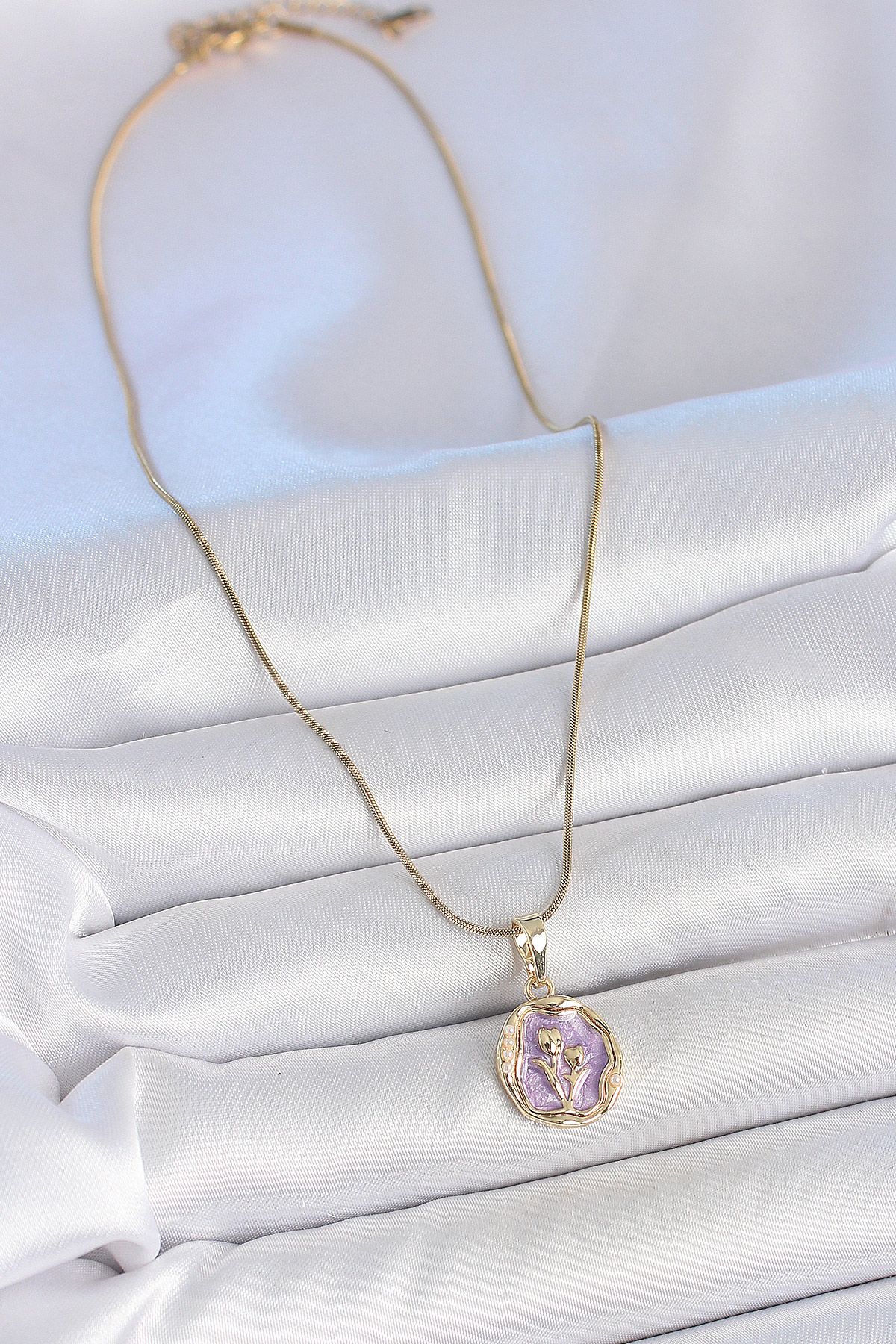 316L Çelik Gold Renk Zincir Mor Mineli Çiçek İşlemeli Portre Model Kadın Kolye - TJ-BKO10164