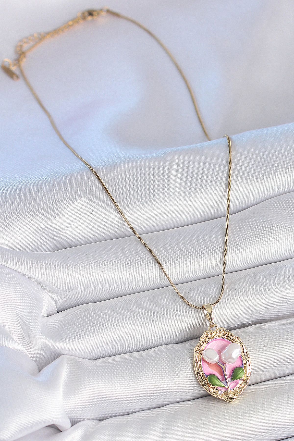 316L Çelik Gold Renk Zincir Pembe Mineli İncili Çiçek İşlemeli Portre Model Kadın Kolye - TJ-BKO10148