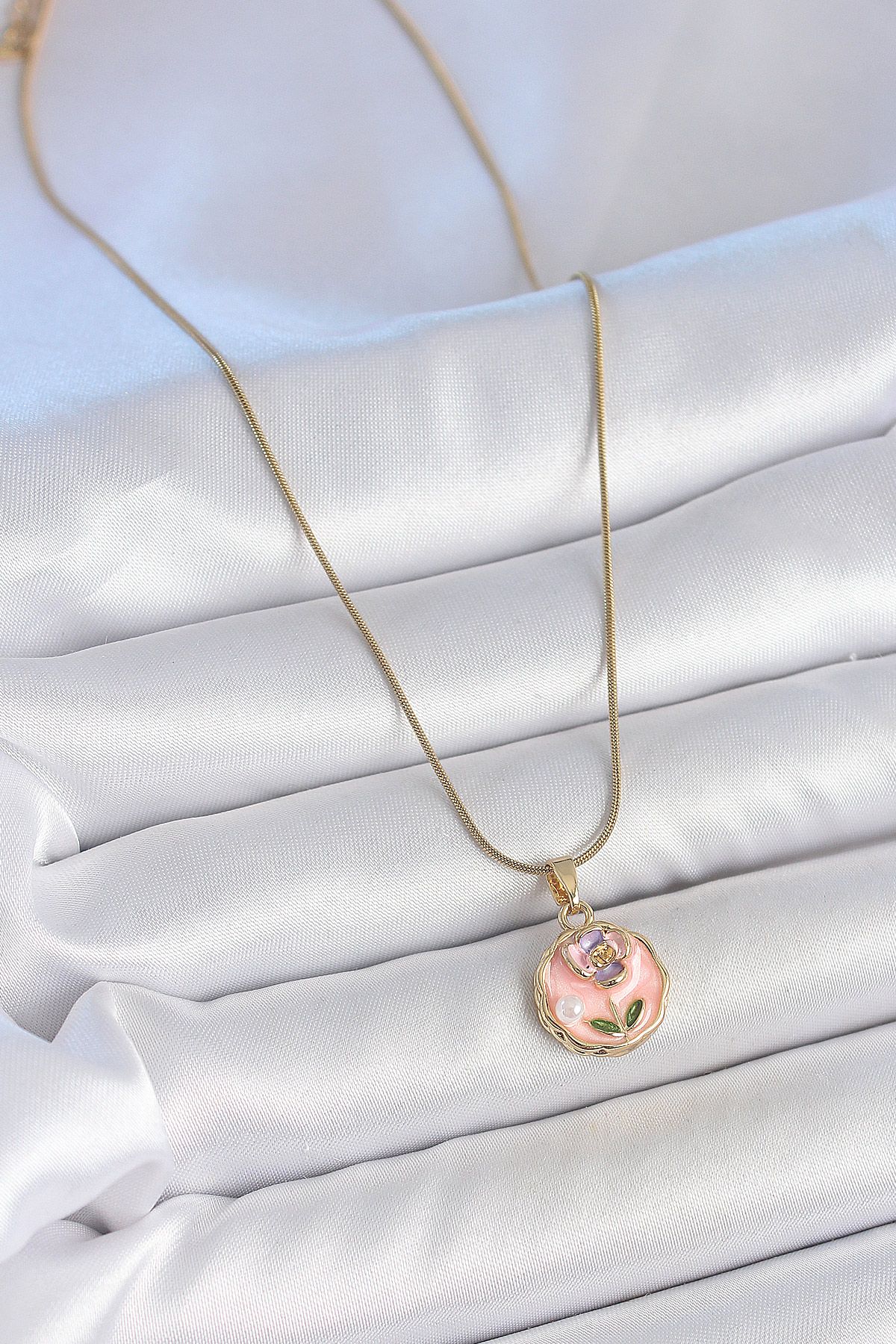 316L Çelik Gold Renk Zincir Pembe Minimal Çiçek İşlemeli İnci Detay Portre Model Kadın Kolye - TJ-BKO10129