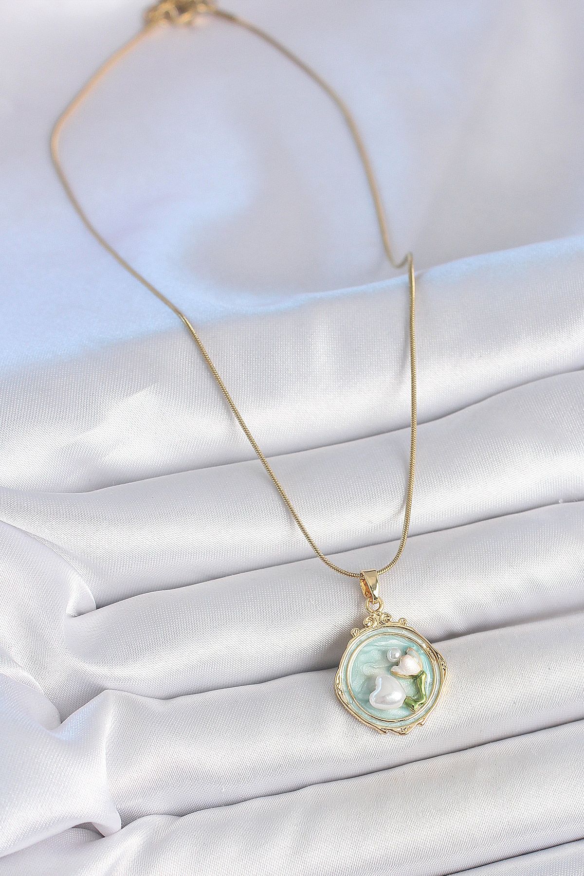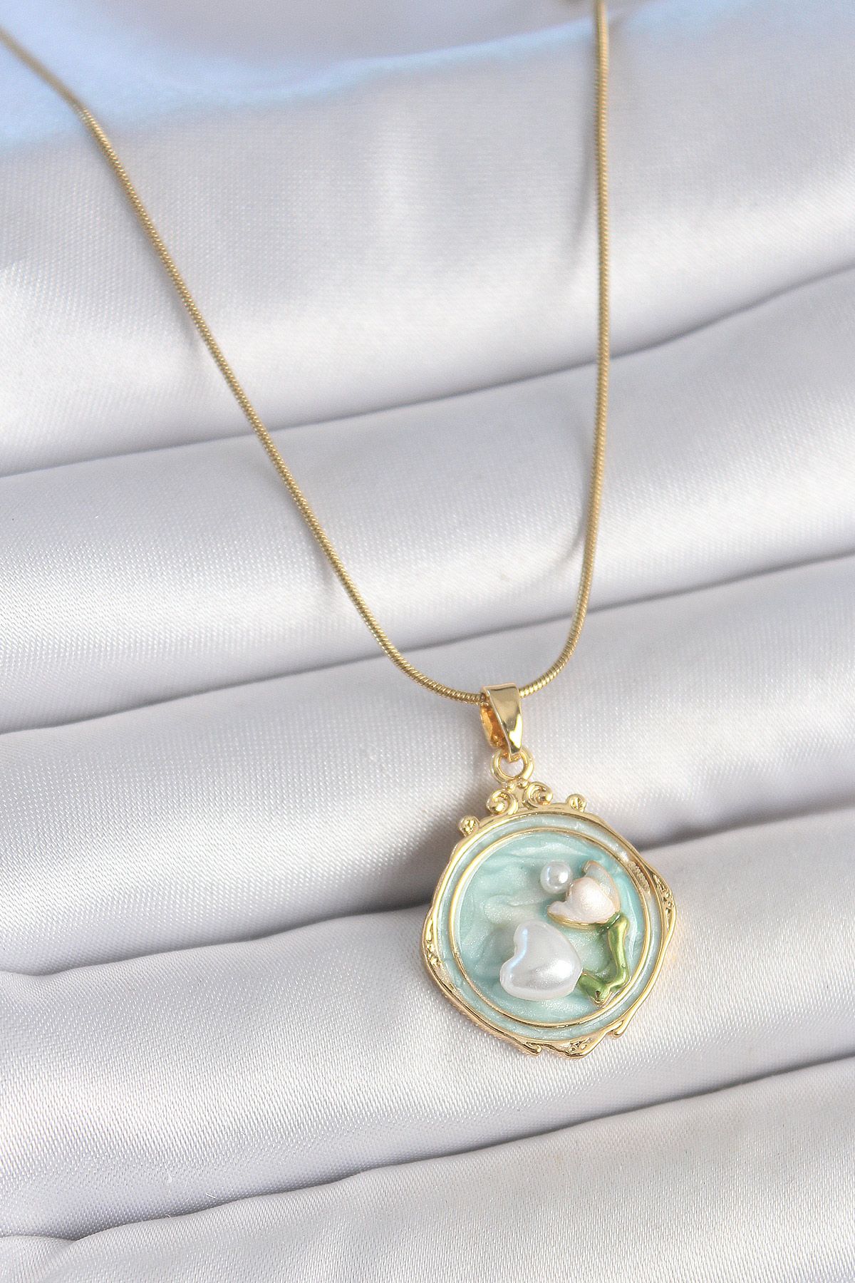 316L Çelik Gold Renk Zincir Turkuaz Mineli İncili Çiçek İşlemeli Portre Model Kadın Kolye - TJ-BKO10150