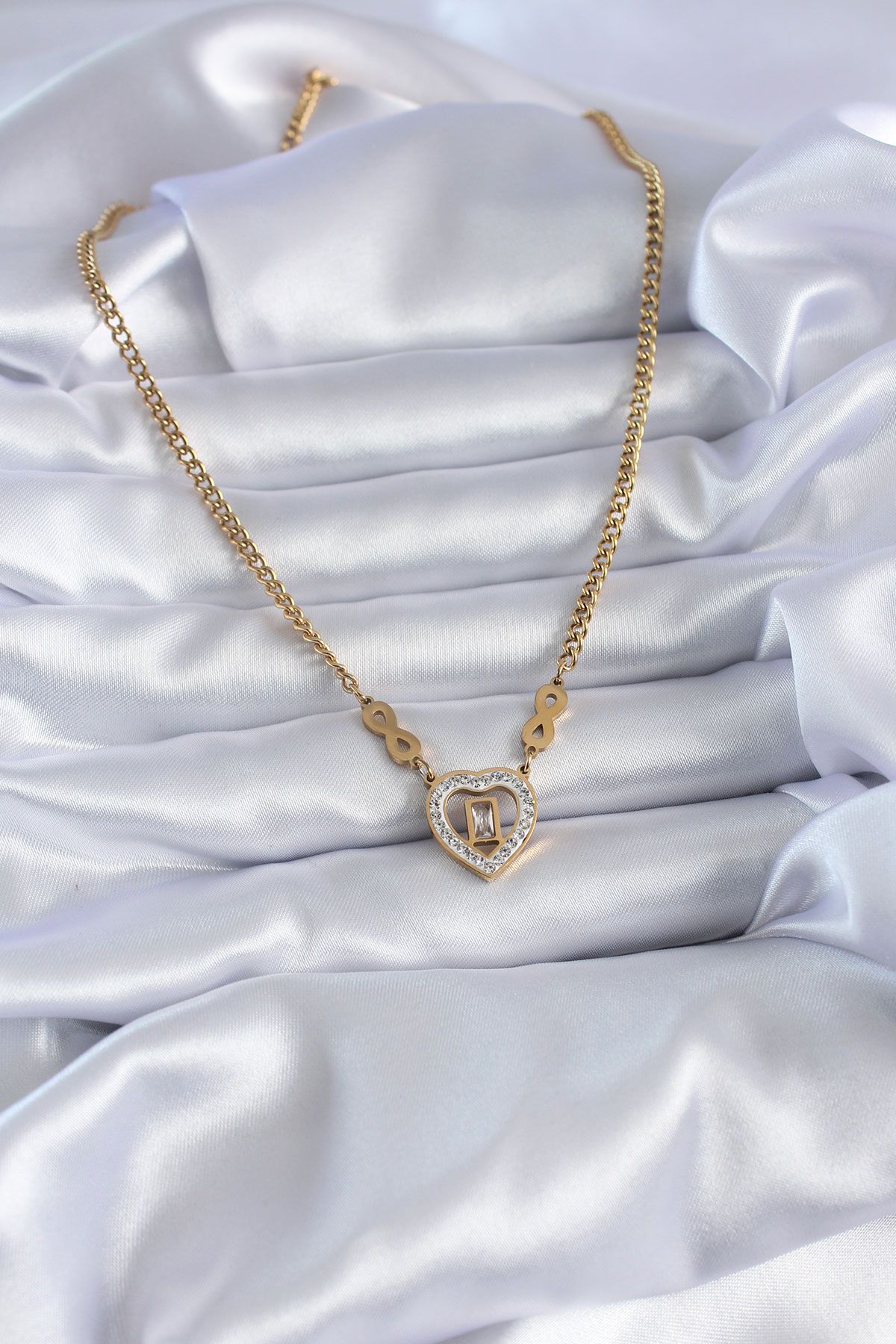 316L Çelik Gold Renk Zirkon Taşlı Kalp Model Sonsuzluk Detay Kadın Kolye - TJ-BKO7789