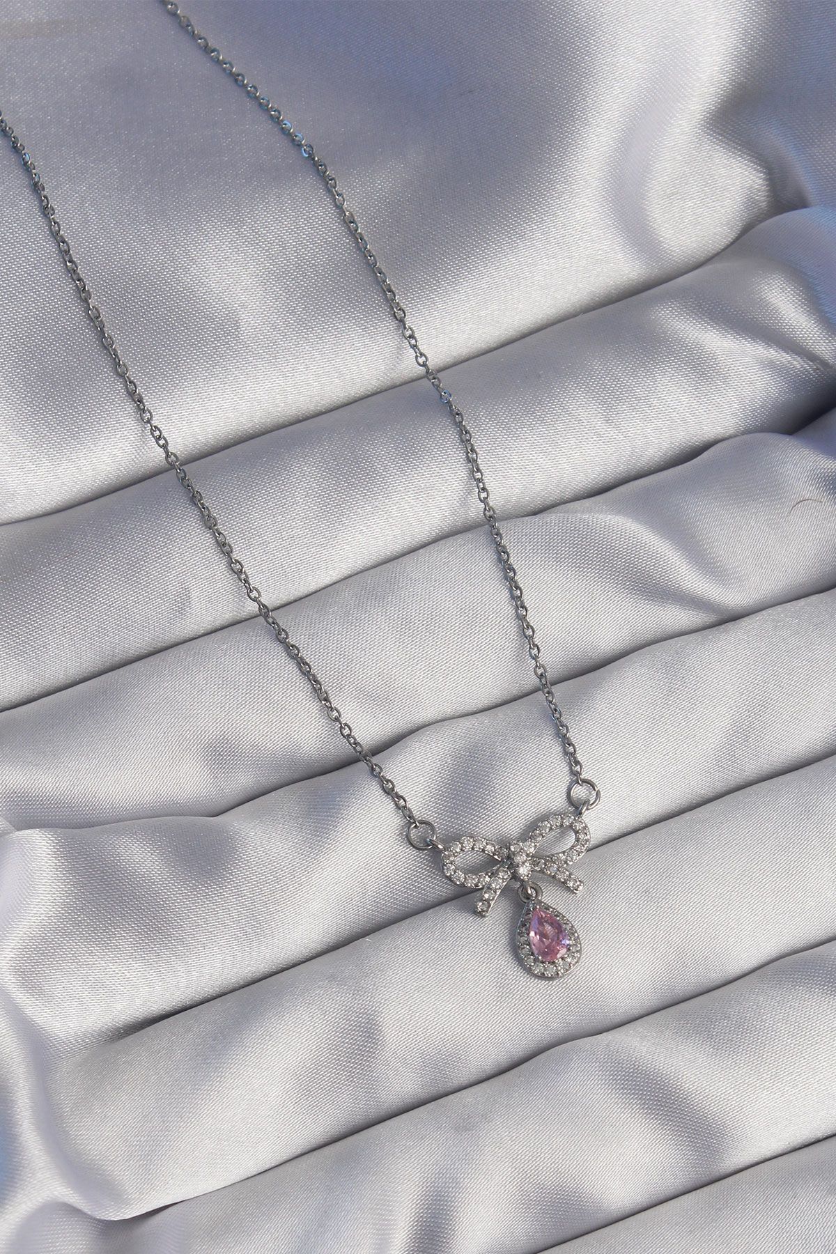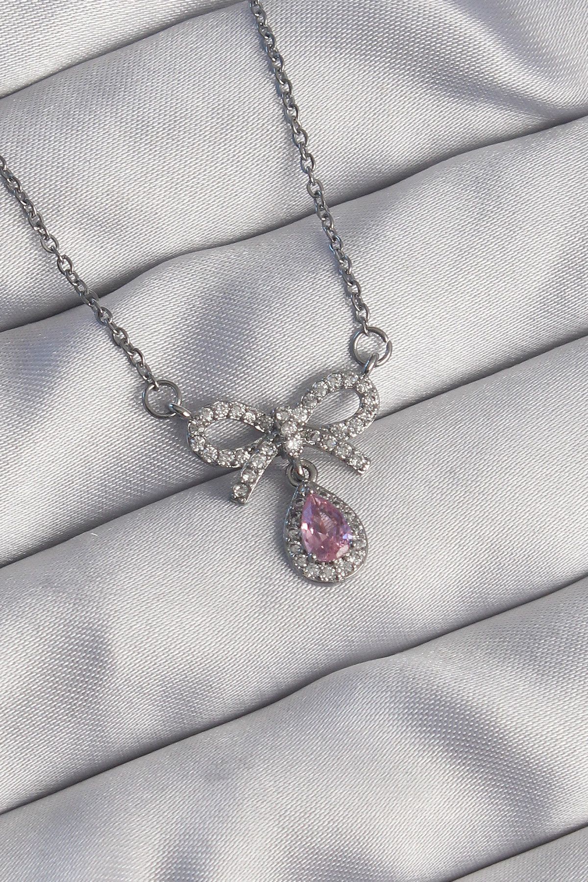 316L Çelik Gümüş Renk Fiyonk Detay Pembe Zirkon Taşlı Damla Kolye - TJ-BKO8921