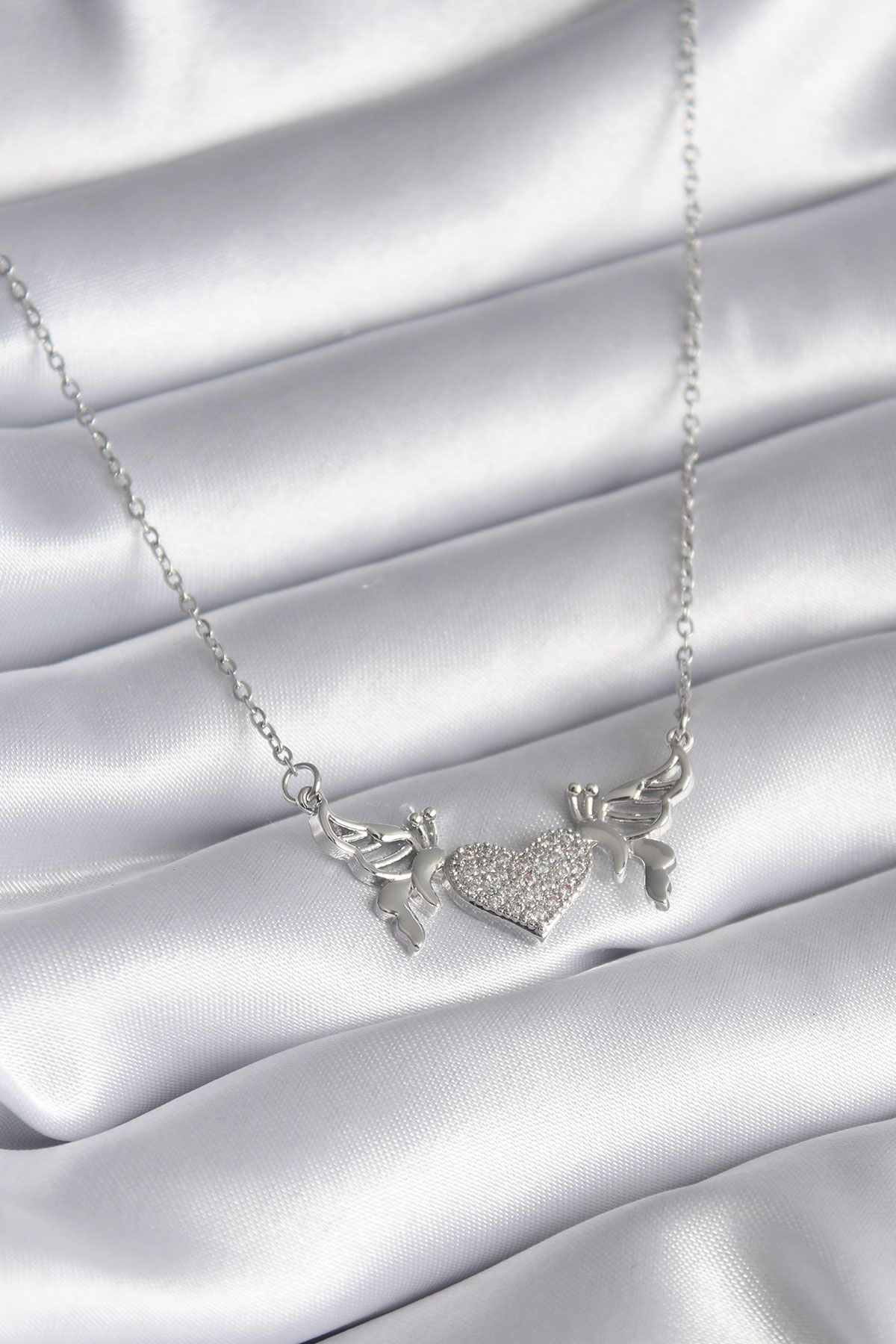 316L Çelik Gümüş Renk Zirkon Taşlı Kanat Kalp Model Kadın Kolye - TJ-BKO8289