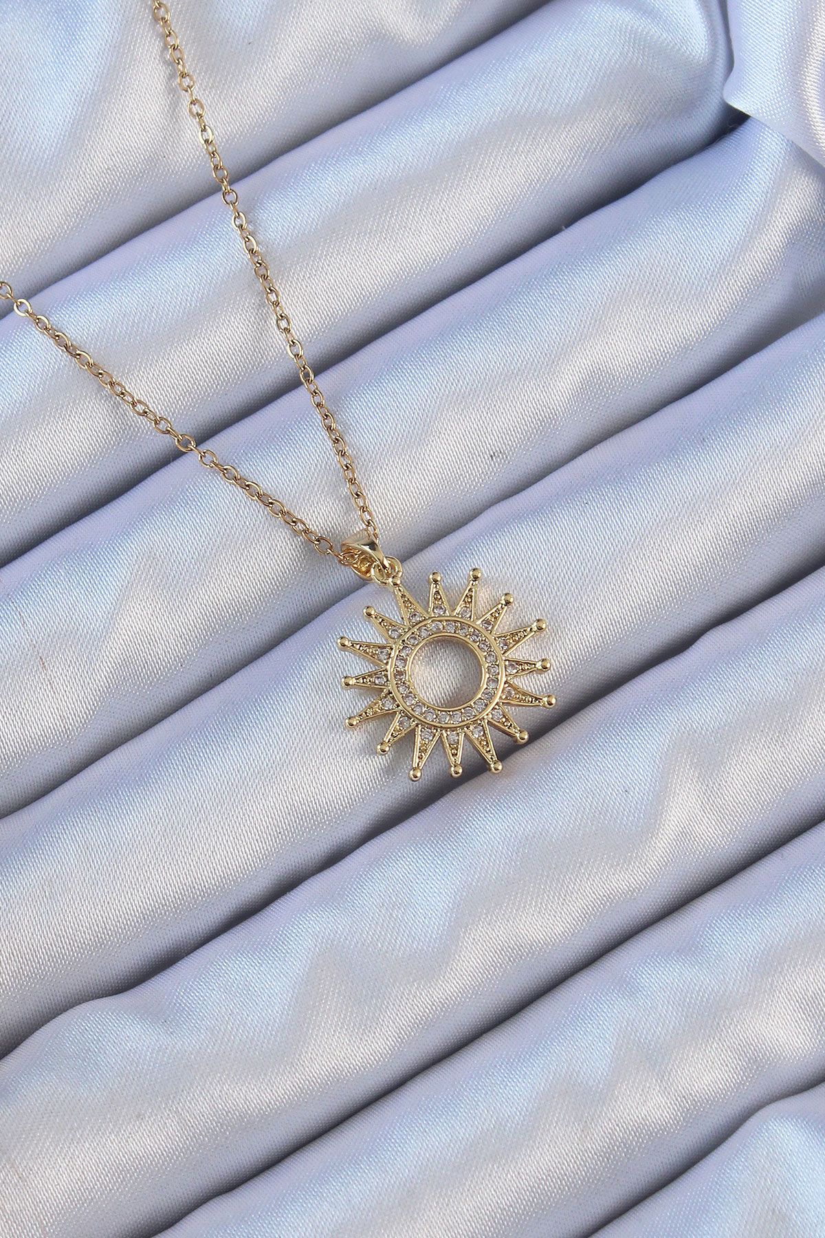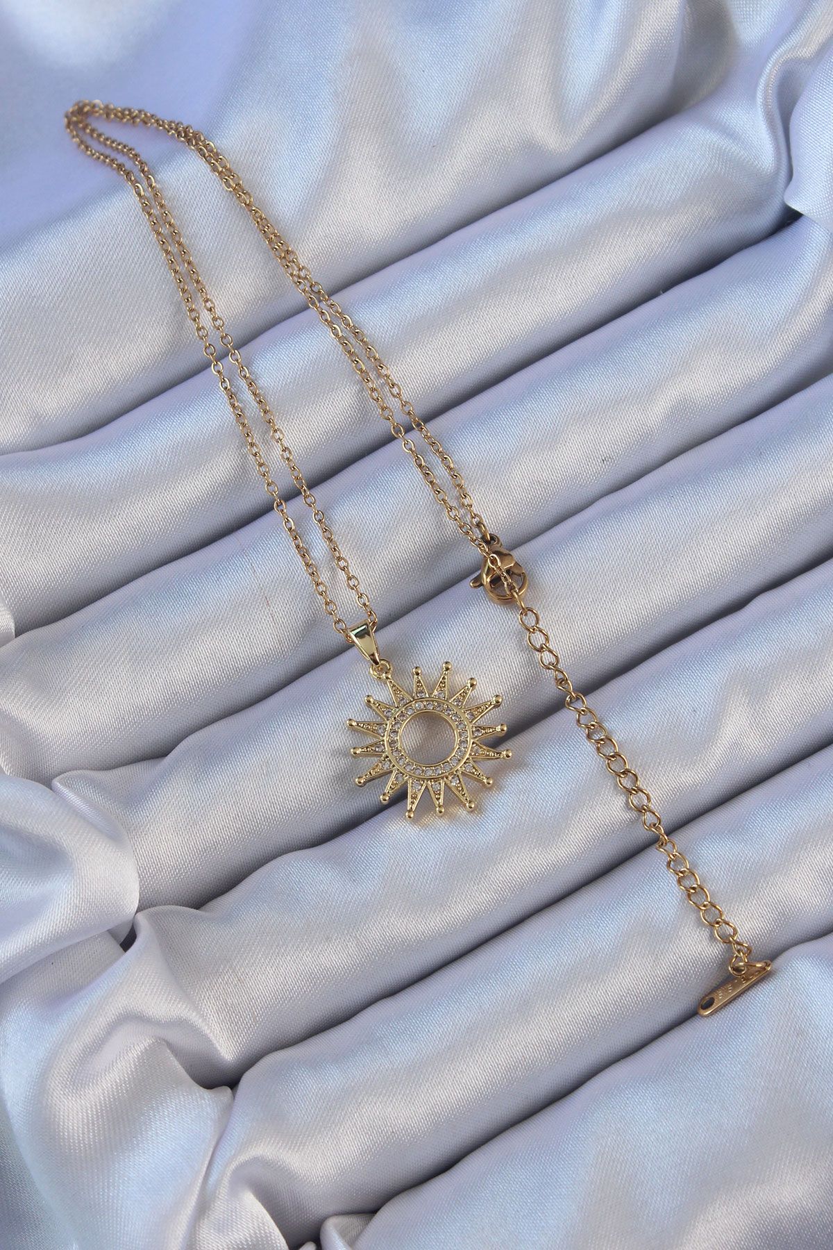 316L Çelik Zincir Altın Renk Zirkon Taşlı Parlayan Güneş Kolye - TJ-BKO9105