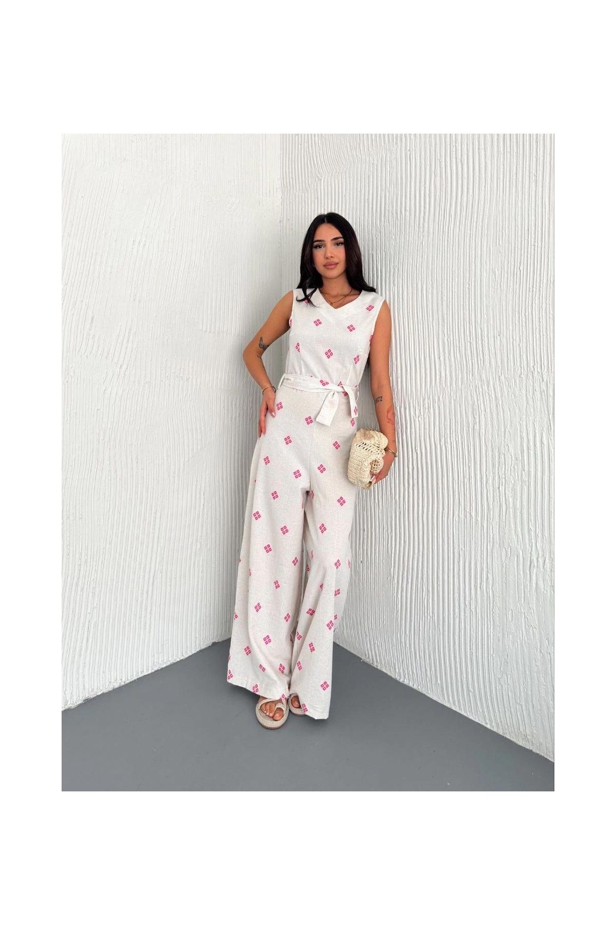 Sırt dekolteli keten beyaz tulum S1036--Sırt dekolteli keten beyaz tulum, gardırobunuzun şıklığını tamamlayacak harika bir seçenektir. Ürün özellikleri: Sırt dekolteli tasarımı ile farklı bir hava katar. Hafif ve rahat keten kumaşı sayesinde yaz aylarında ideal bir seçenektir. Vücuda oturan kesimi ile şık ve modern bir görünüm sunar. Özel günlerde veya günlük kullanımda tercih edebileceğiniz şık bir parçadır. Renk: Beyaz Materyal: Keten Ürün Kodu: S1036