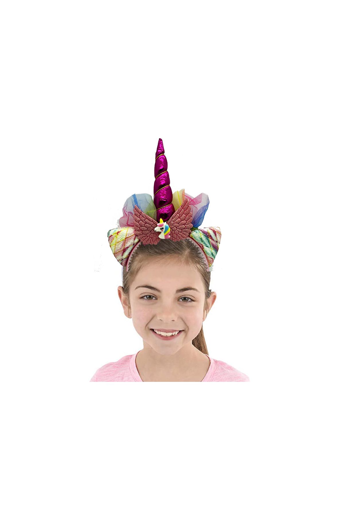 Fuşya Boynuzlu Tüllü Kanatlı Unicorn Tacı 17x27 cm