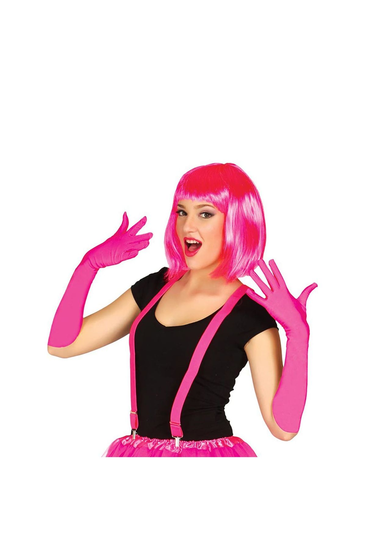 Fuşya Renk Saten Uzun Eldiven ve Küt Parti Peruğu