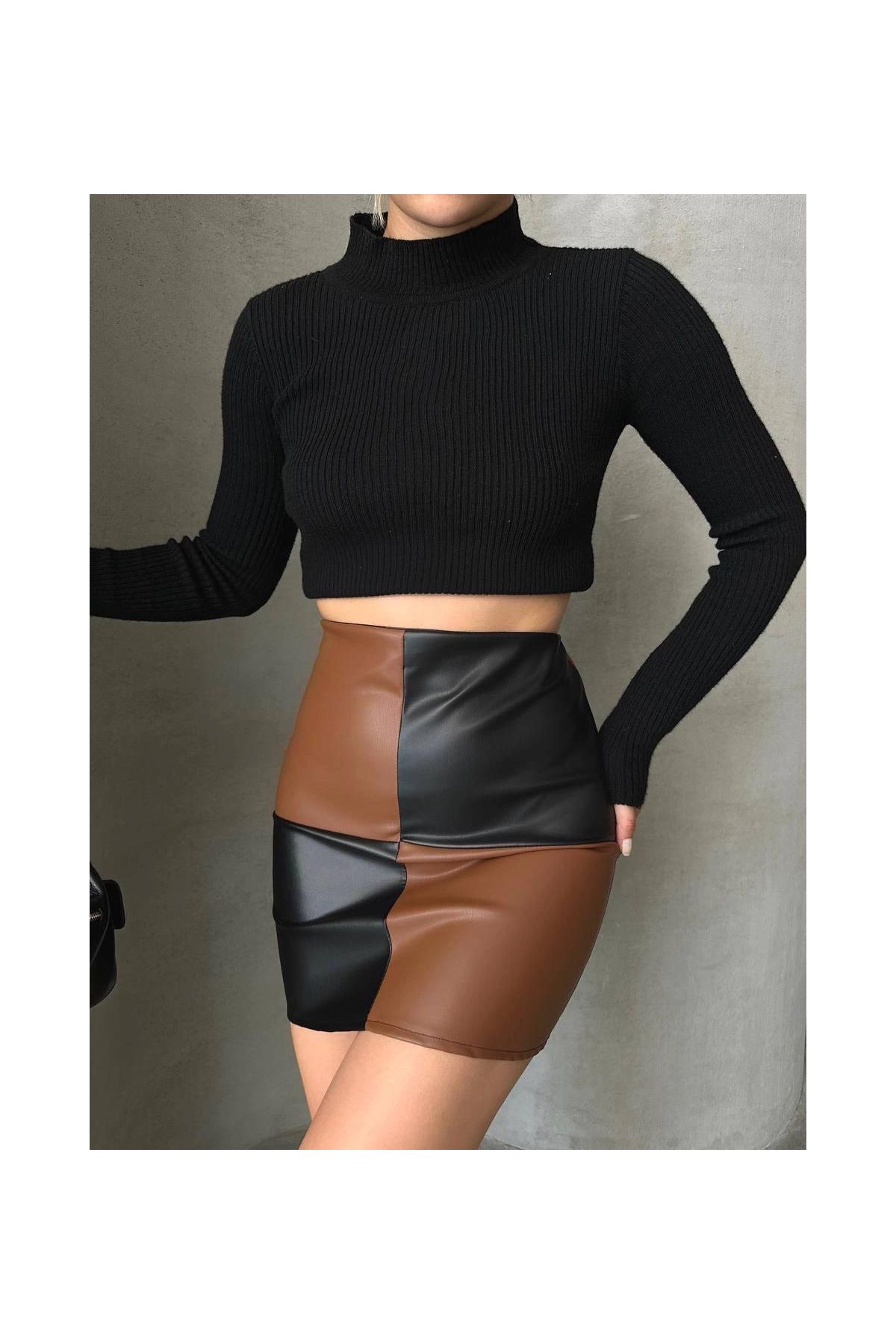 Damalı deri etek siyah kahve w24648--Damalı deri etek siyah ve kahve çift renk karışımı ile orijinal kuzu derisidir yumuşak bir yapıya sahiptir aynı zamanda az da olsa esnektir ve vücuda oturur normal günlerde ve özel günlerde tercih edilebilir bir parça dolabıınızda bulunması gereken parçalardan biri