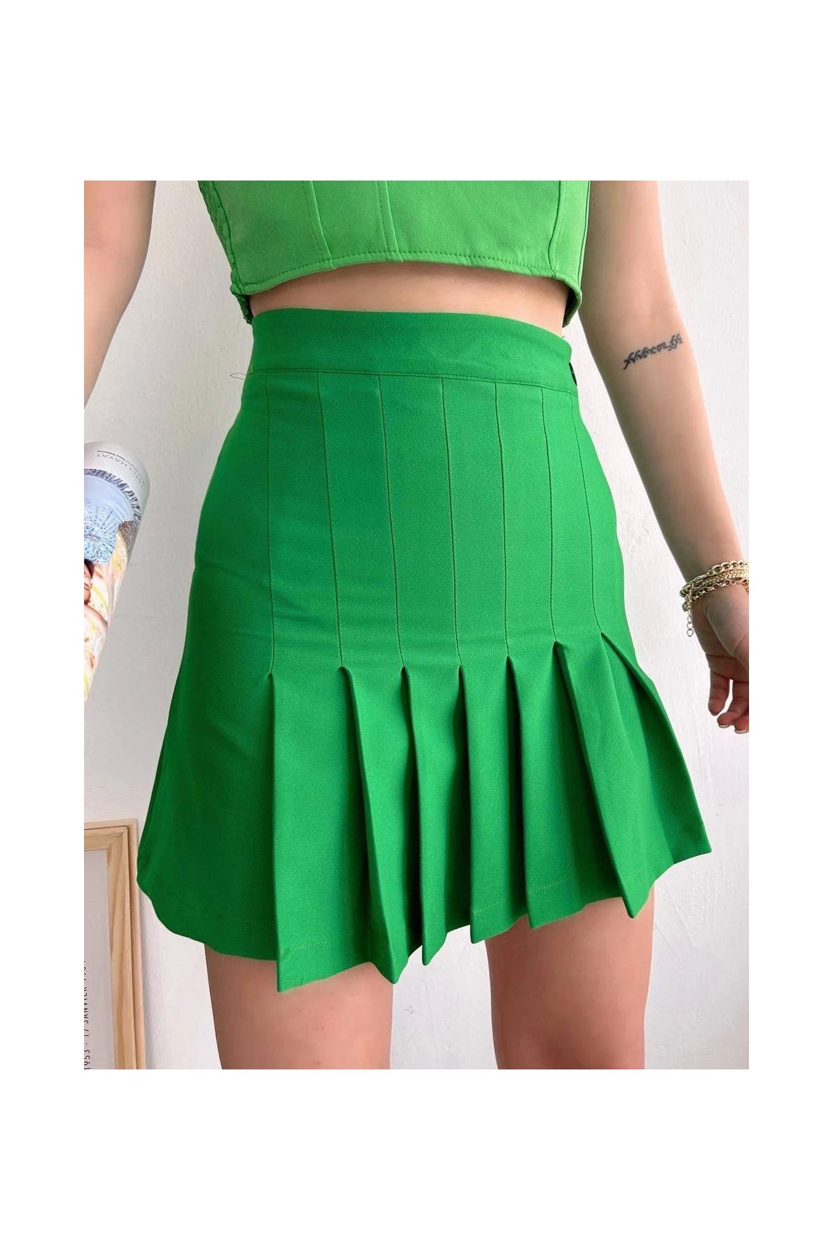 Pileli düğmeli etek açık yeşil s24811--Şık ve zarif bir görünüm elde etmek isteyen kadınlar için ideal bir seçim olan Pileli Düğmeli Etek, gardırobunuzun vazgeçilmez parçalarından biri olmaya aday. Açık yeşil rengi ile doğanın tazeliğini yansıtan bu etek, her mevsim kolaylıkla kombinlenebilir özelliğiyle dikkat çekiyor. Pileli tasarımıyla hareket katan etek, vücuda uyumlu kesimi sayesinde şıklık ve rahatlığı bir arada sunuyor. Düğme detaylarıyla modern bir hava katan bu eteği günlük hayatta ya da özel davetlerde rahatlıkla kullanabilir, tarzınızı ön plana çıkarabilirsiniz. Kumaş: %100 polyester Renk: Açık Yeşil Kemer detayı bulunmaktadır. Belinde lastikli ve ayarlanabilir tasarımı sayesinde kolayca giyilebilir. Standart beden olup, S/M/L gibi seçenekleri bulunmaktadır.
