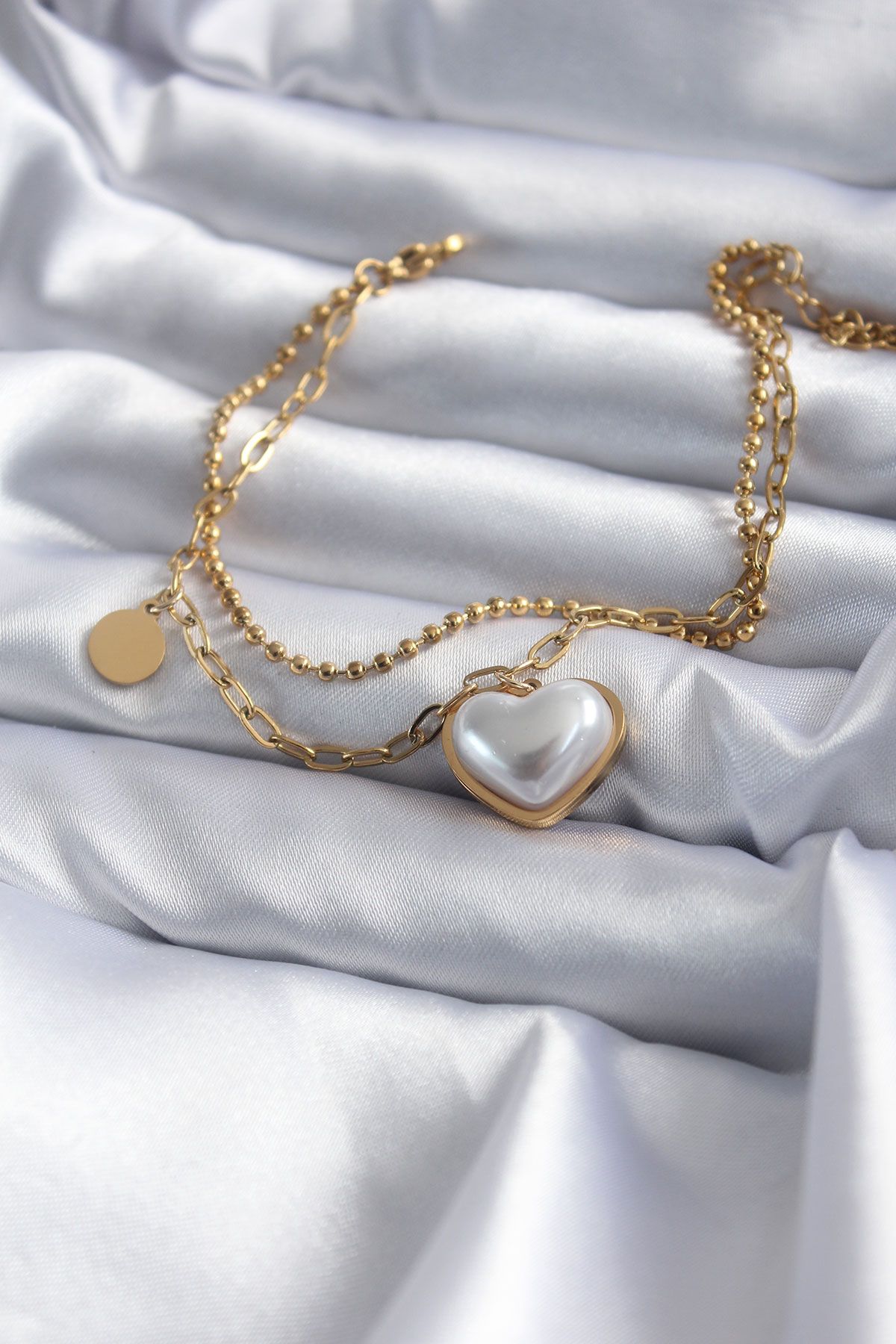 943 316L Çelik Gold Renk 2\\&aposli Zincir Model İnci Kalp Figür Kadın Bileklik