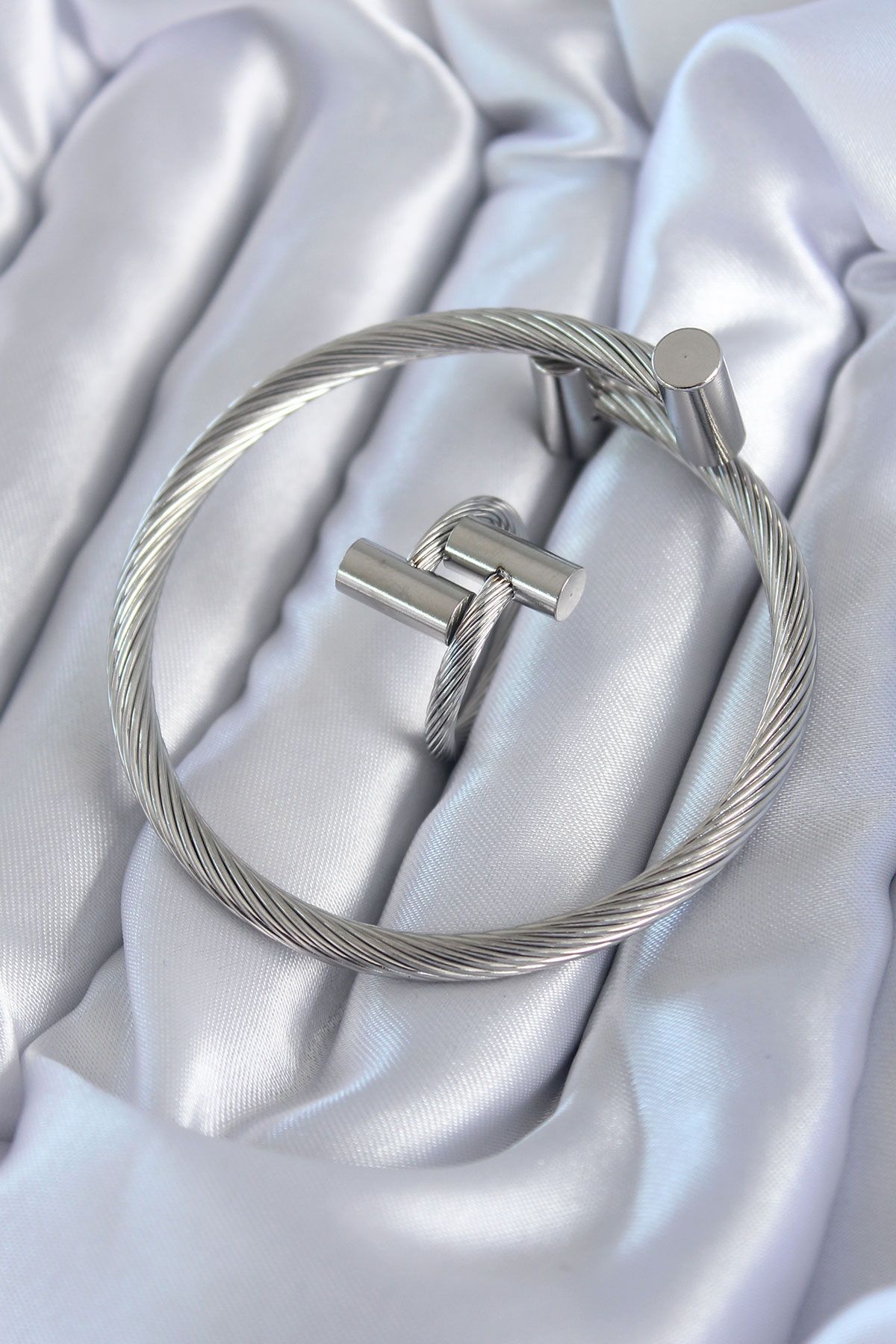 943 316L Çelik Gümüş Renk Sarmal Model Erkek Bileklik Yüzük Kombini