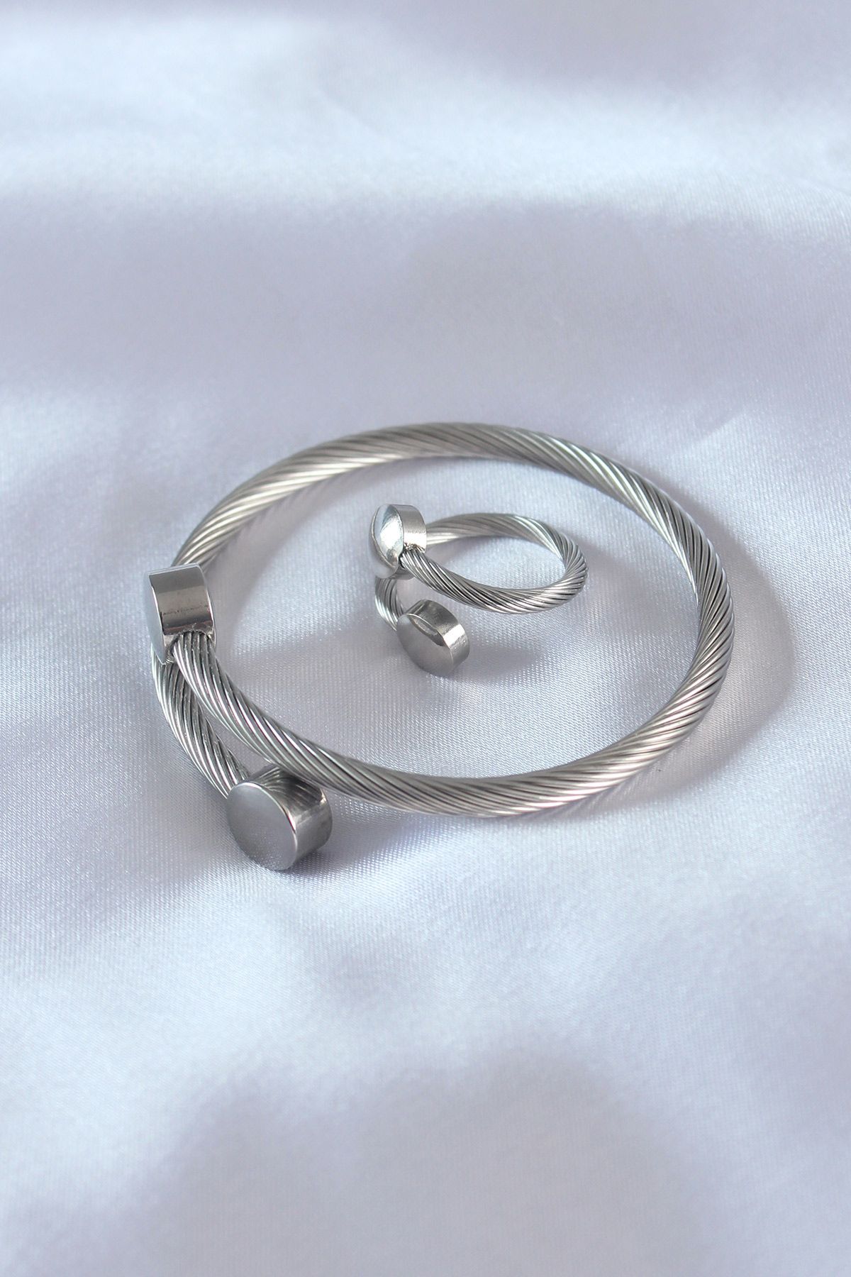 943 Çelik Gümüş Renk Sıkı Burgu Model Erkek Bileklik Yüzük Seti