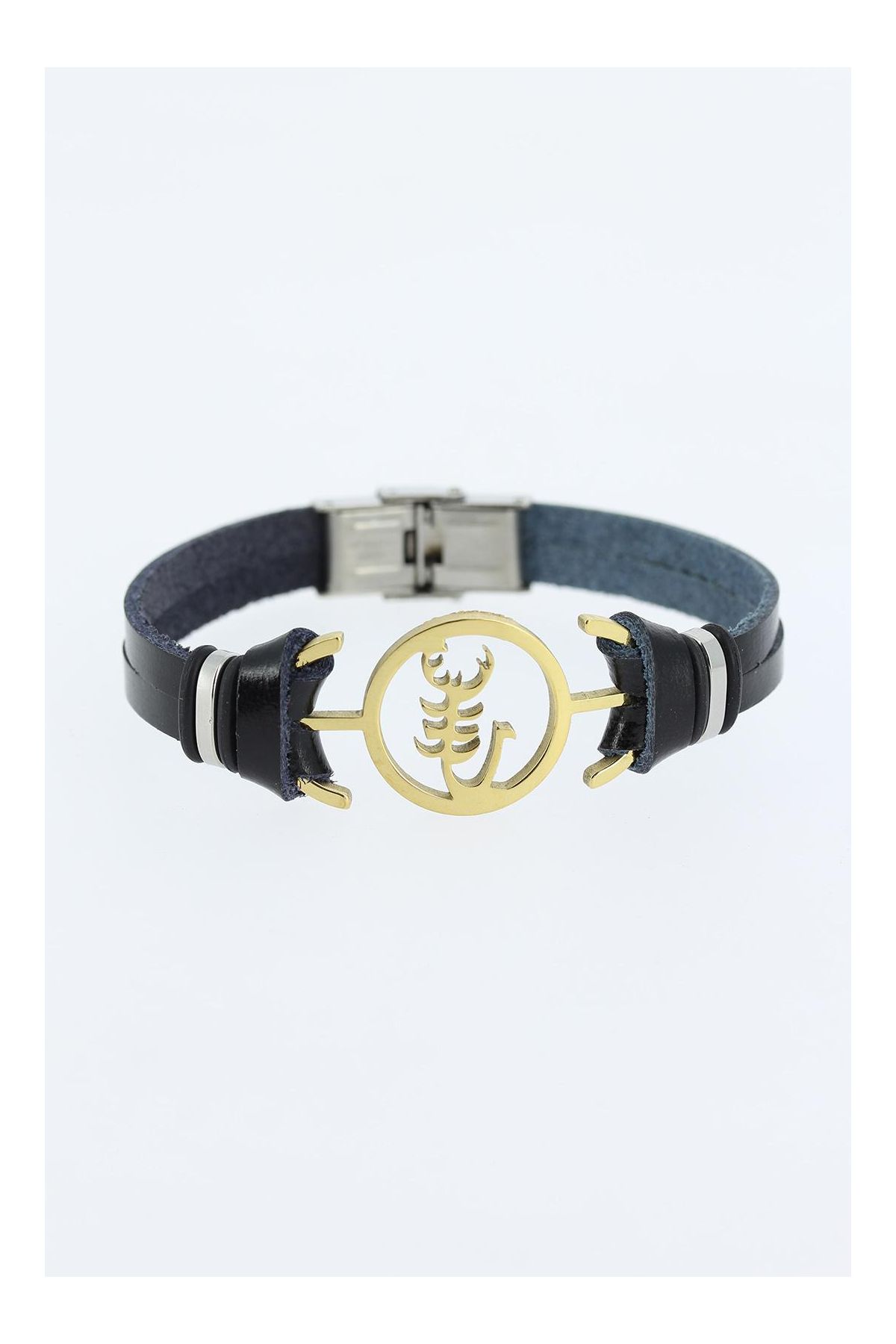 Gold Renk Çelik Akrep Figürlü Metal Aksesuarlı Siyah Renk Deri Erkek Bileklik