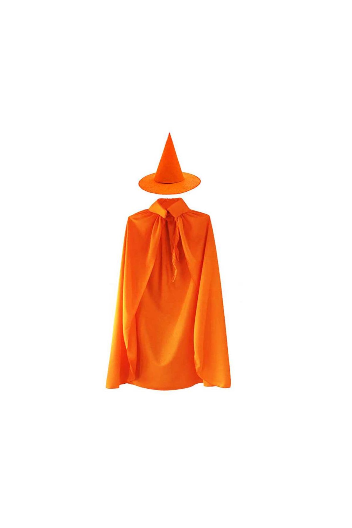 Yetişkin Boy 120 cm Turuncu Yakalı Pelerin ve Turuncu Cadı Şapkası