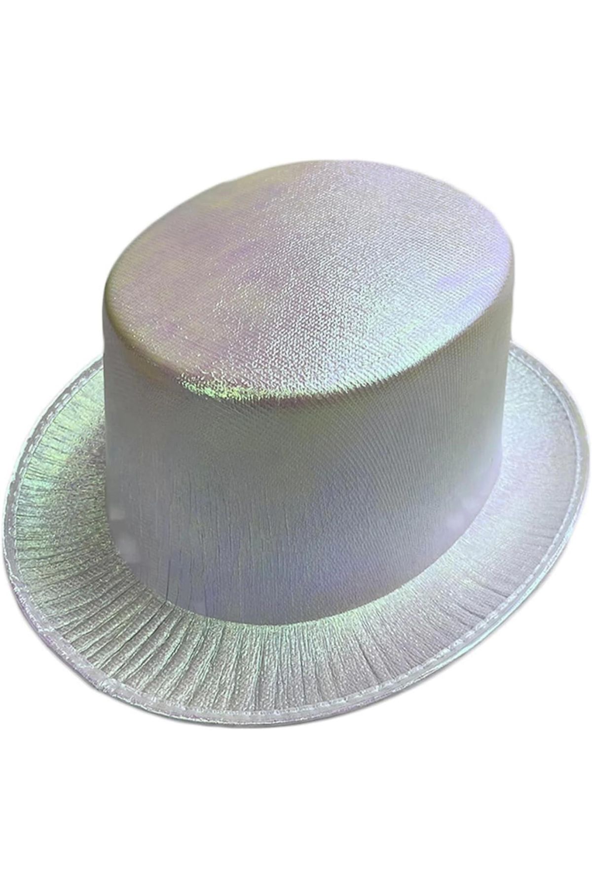 Beyaz Renk Işıltılı Hologram Kumaş Kaplama Fötr Silindir Şapka Yetişkin Boy
