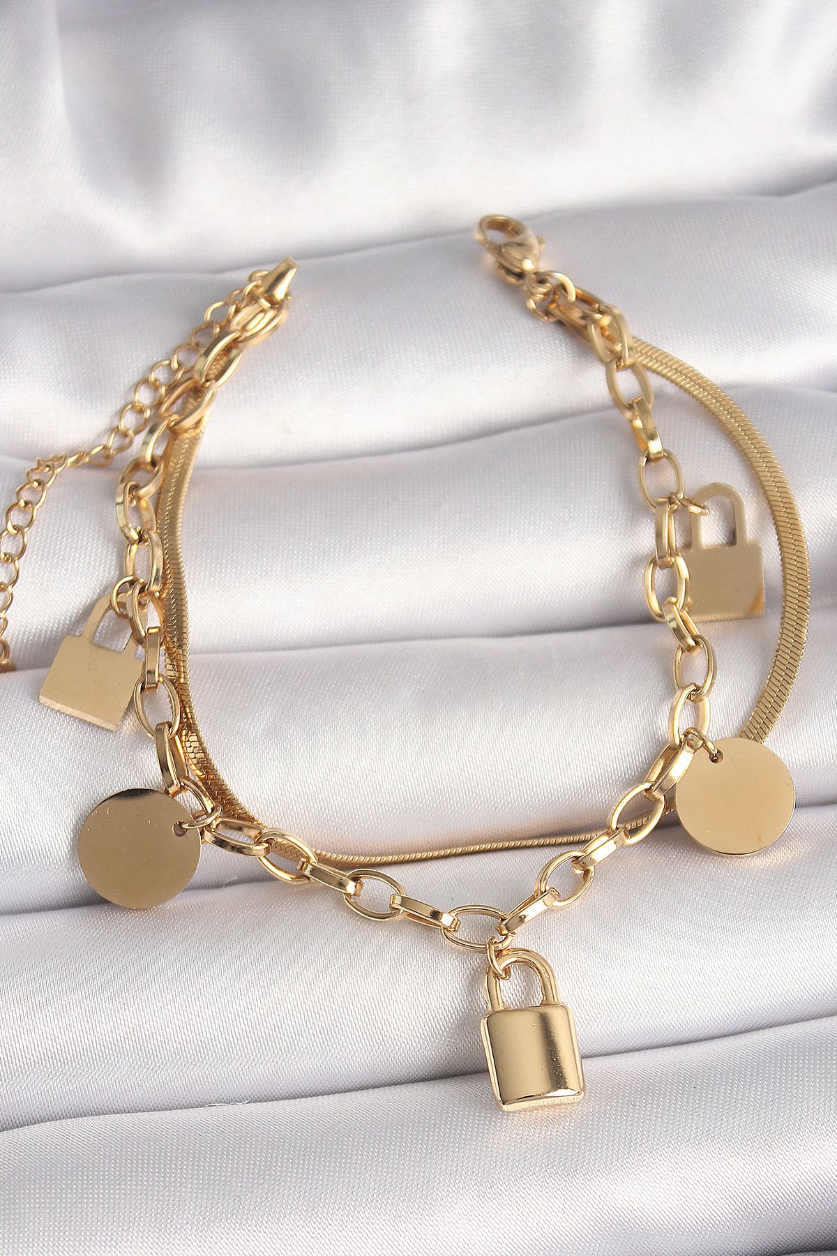 316L Çelik Gold Renk 2'Li İtalyan Zincir Kilit Figür Kadın Bileklik - TJ-BB6760
