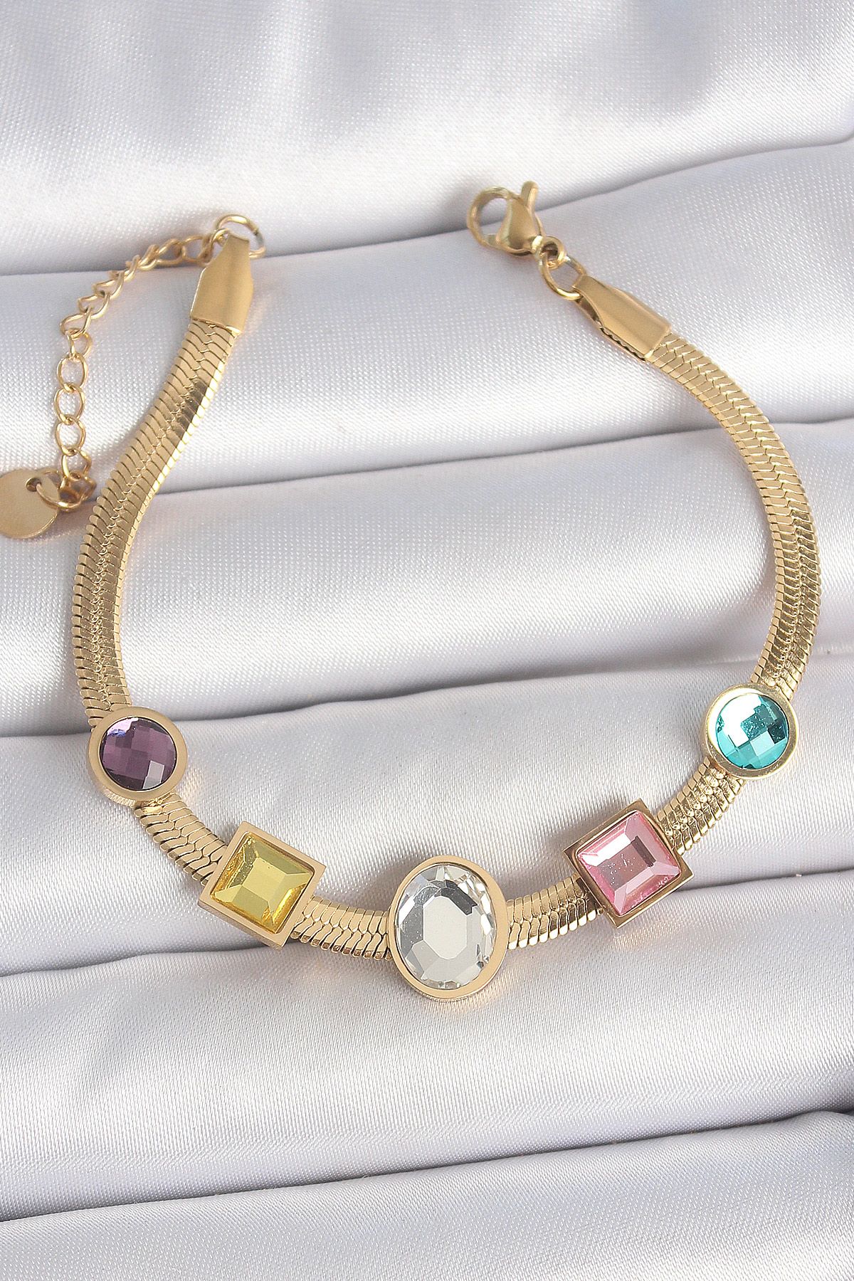 316L Çelik Gold Renk İtalyan Zincir Renkli Zirkon Taşlı Kadın Bileklik - TJ-BB6956