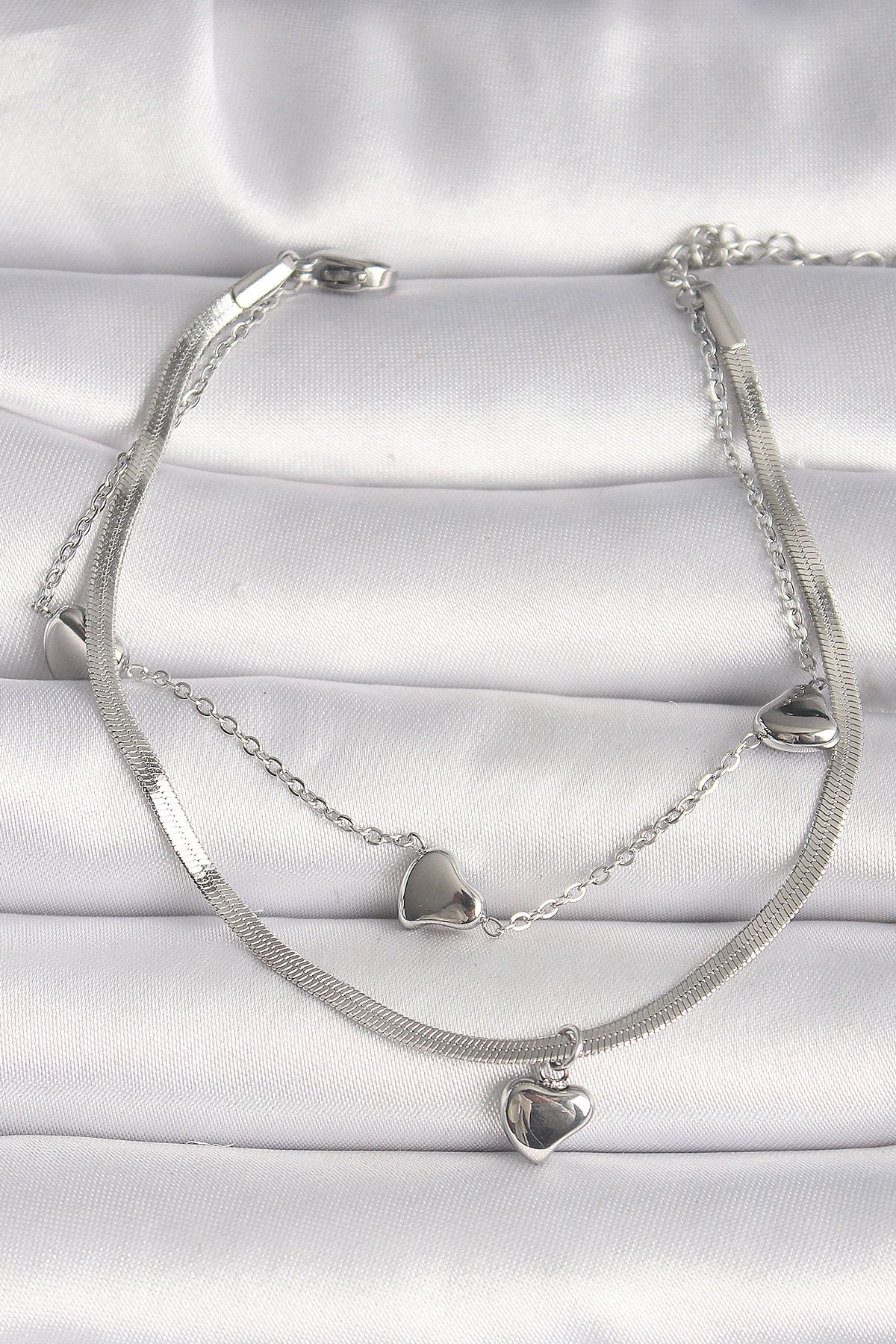 316L Çelik Gümüş Renk 2'Li İtalyan Zincir Model Sallantı Kalp Figür Kadın Bileklik - TJ-BB6750