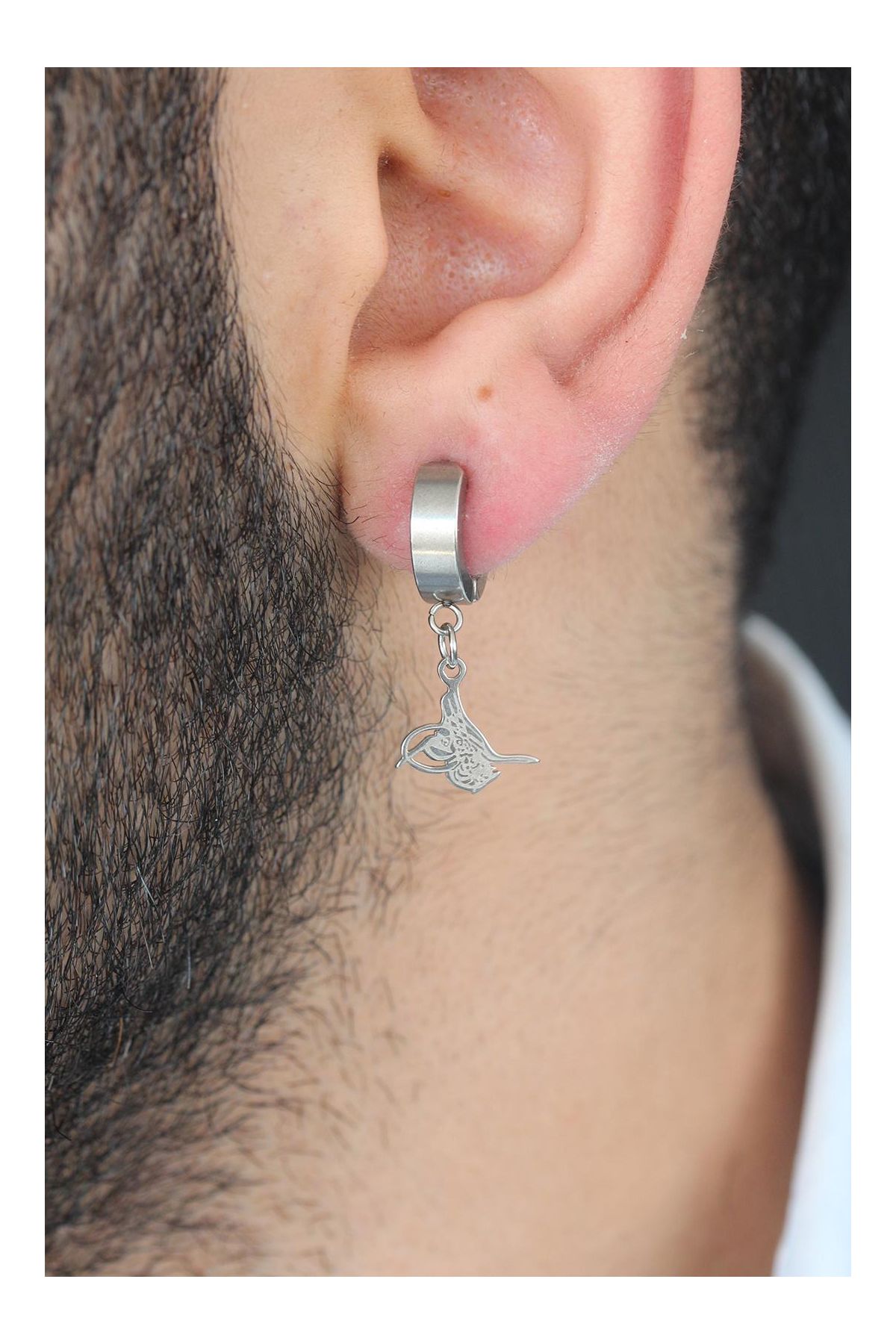 Silver Renk Kaplama Osmanlı Tuğra Figürlü Kıstırmalı Çelik Erkek Küpe - TJ-EKP117