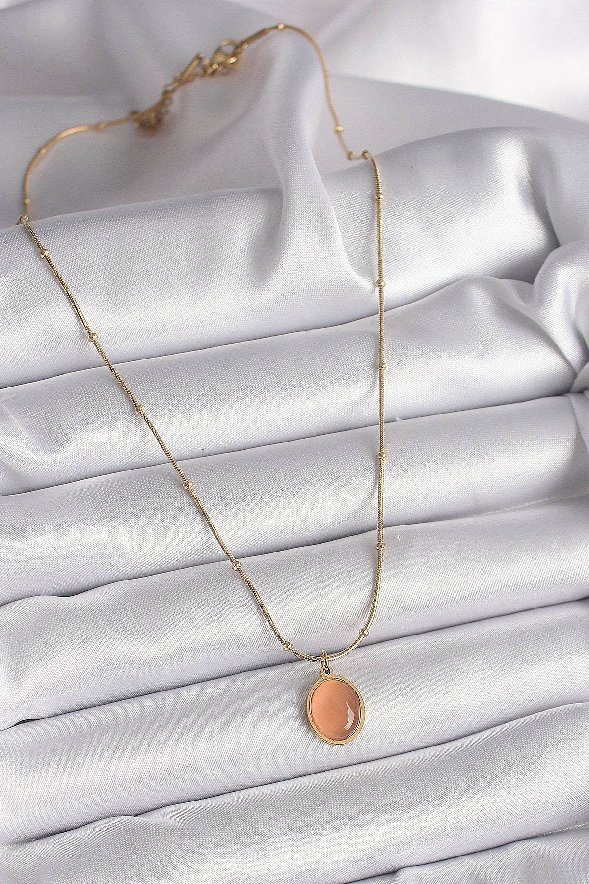 316L Çelik Gold Renk Turuncu Kedi Gözü Sedefli Oval Model Kadın Kolye - TJ-BKO9559
