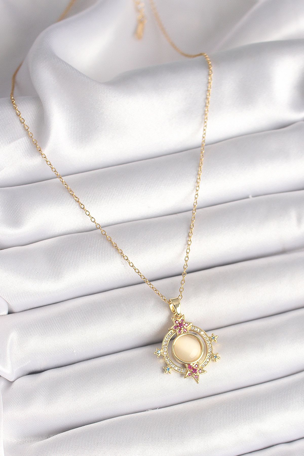 316L Çelik Gold Renk Zincir Beyaz Sedefli Zirkon Taşlı Yıldız Detay Kadın Kolye - TJ-BKO9871