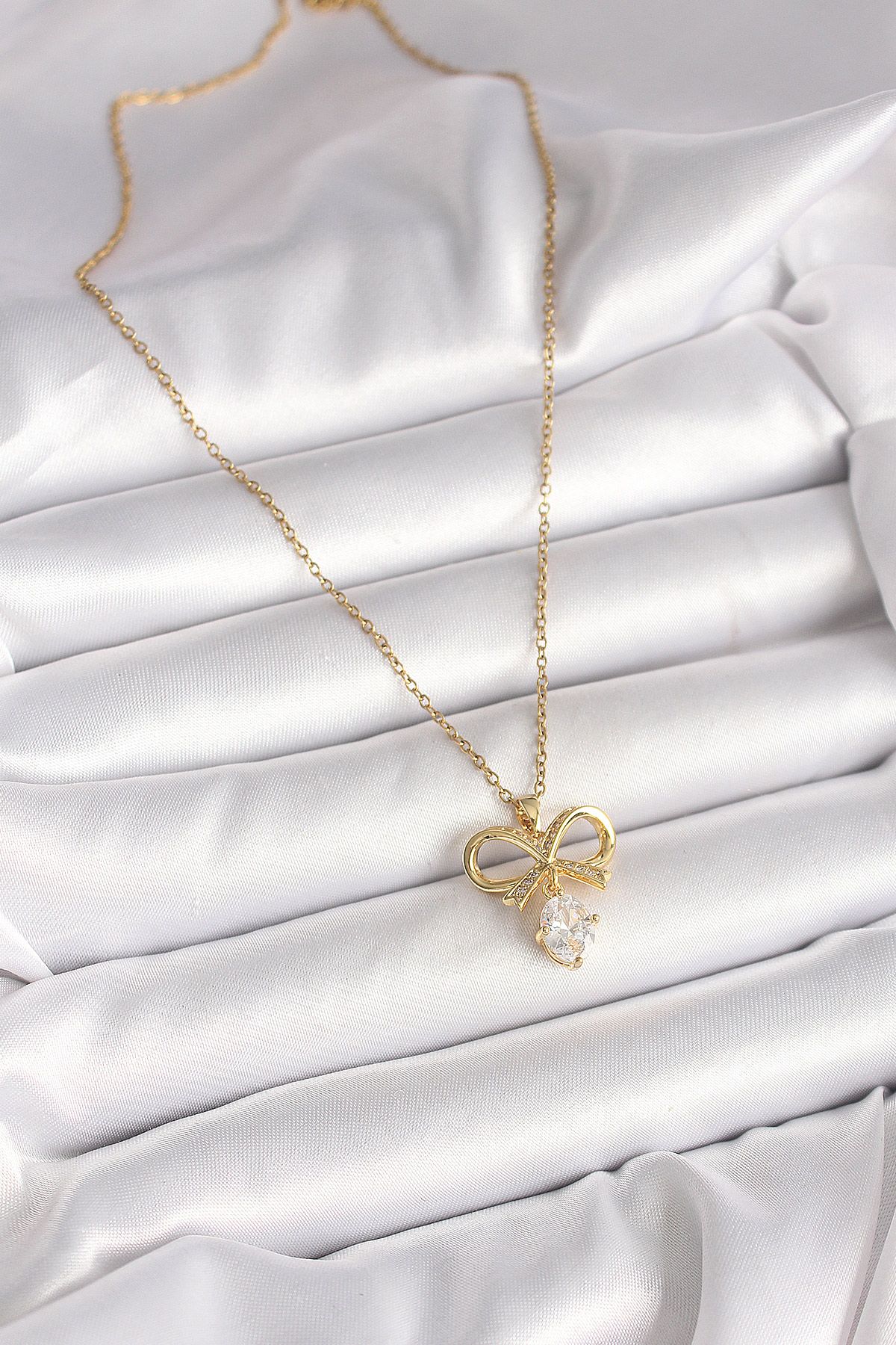 316L Çelik Gold Renk Zincir Zirkon Taşlı Kurdele Model Kadın Kolye - TJ-BKO9960