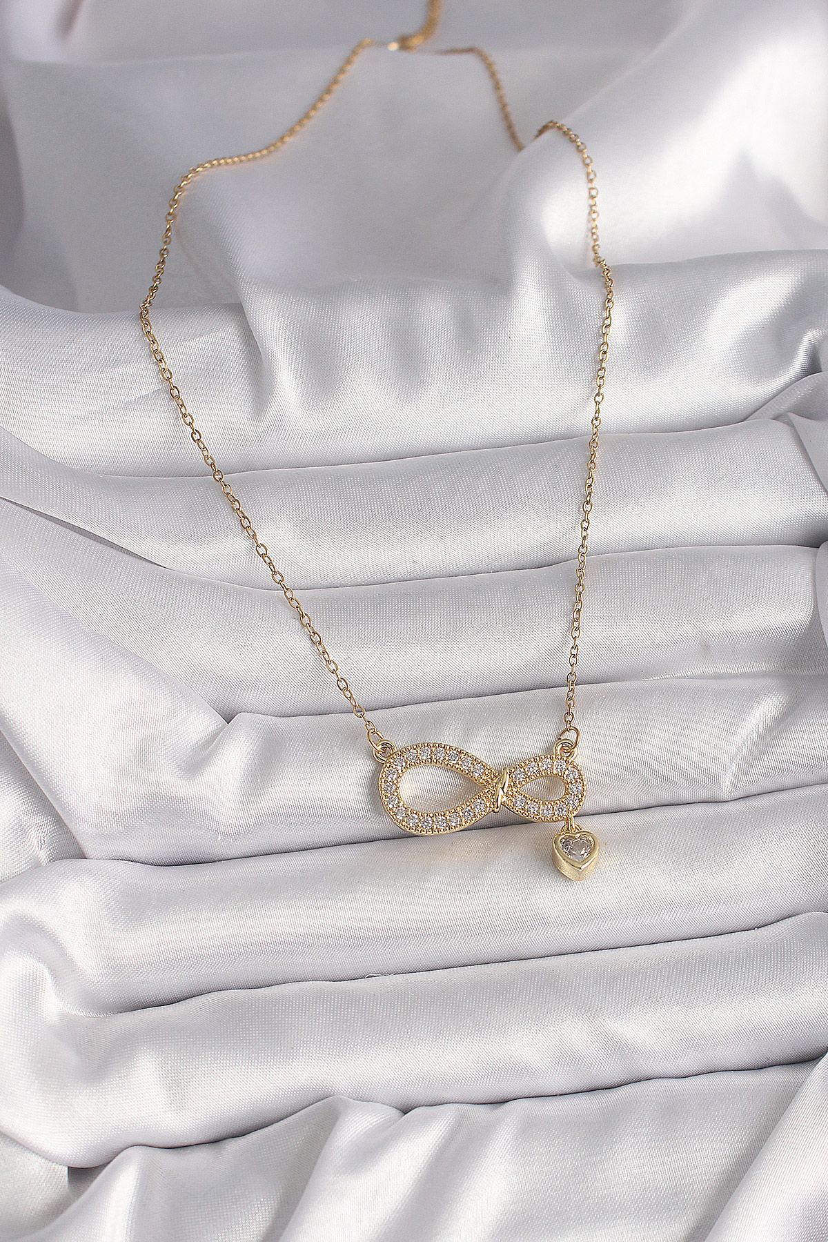 316L Çelik Gold Renk Zincir Zirkon Taşlı Sonsuzluk Model Sallantı Taşlı Kalp Detay Kadın Kolye - TJ-BKO9800