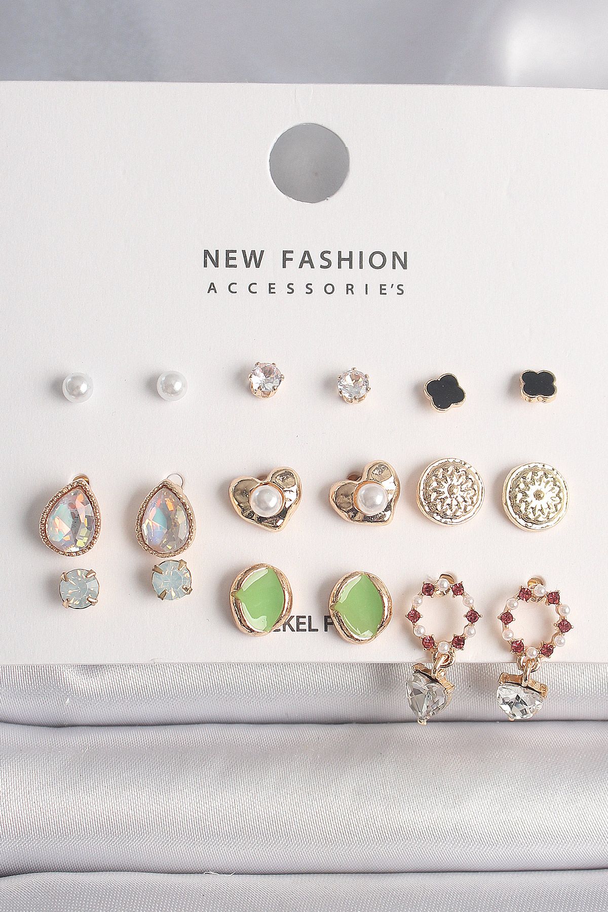 Pirinç Gold Renk Damla Zirkon Taşlı İncili Kalp Detay 9 Çift Kadın Küpe Seti - TJ-BKP10181