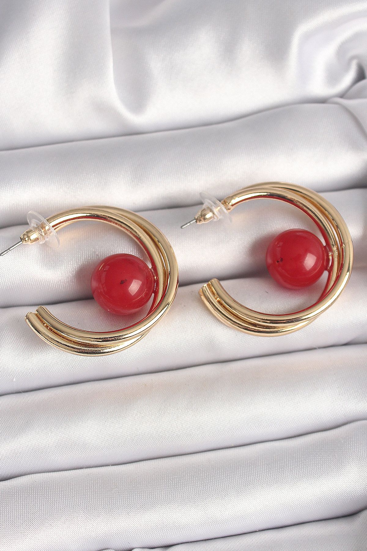 Pirinç Gold Renk Halka Model Kırmızı Boncuk Detay Kadın Küpe - TJ-BKP10366