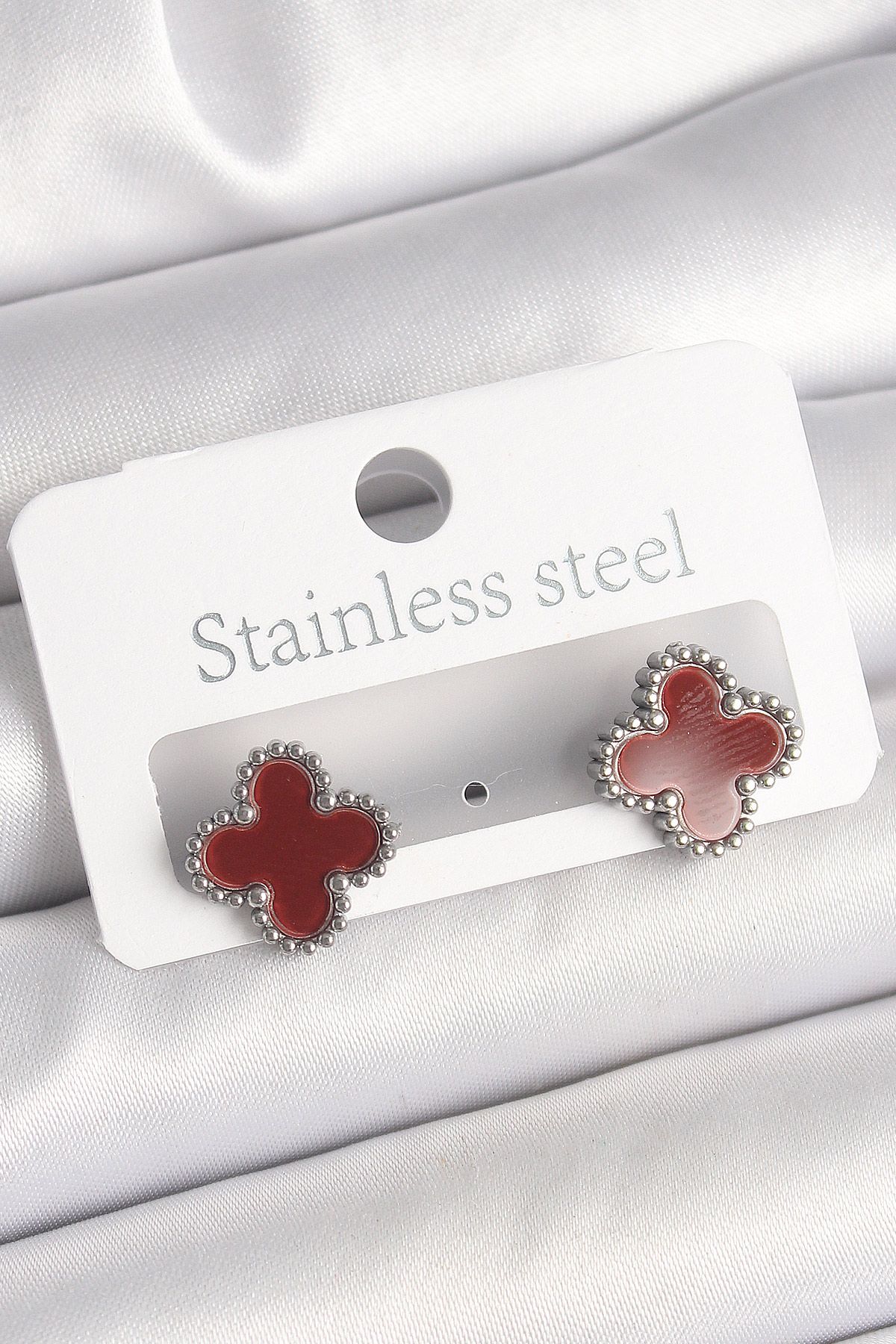 Pirinç Gümüş Renk Bordo Yonca Model Kadın Küpe - TJ-BKP10359