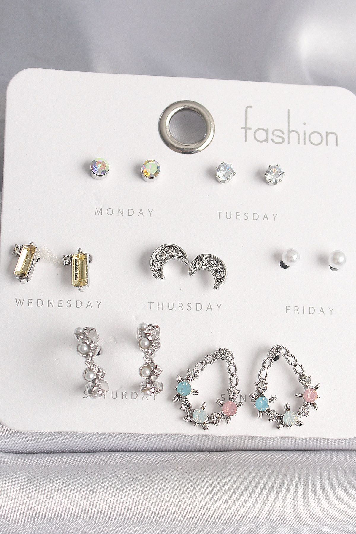 Pirinç Gümüş Renk Renkli Zirkon Taşlı Halka Damla Figür Hilal Detay 7 Çift Kadın Küpe Seti - TJ-BKP10187