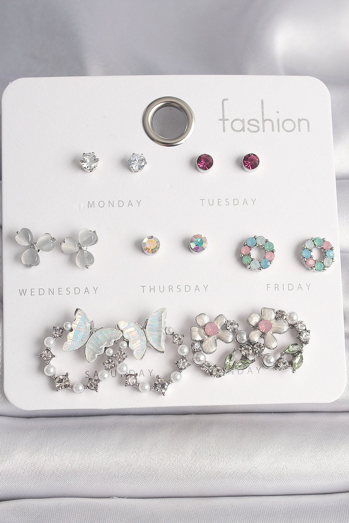 Pirinç Gümüş Renk Zirkon Taşlı Kelbekli Çiçekli Halka Model 7 Çift Kadın Küpe Seti - TJ-BKP10141