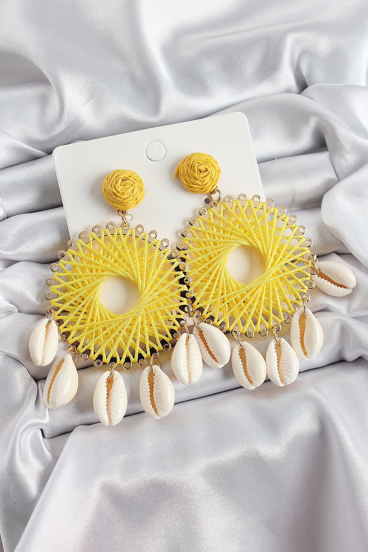 Sarı Hasır Örgü Sarmal Model Sallantılı Deniz Kabuğu Detaylı Gold Renk Kadın Küpe - TJ-BKP10726