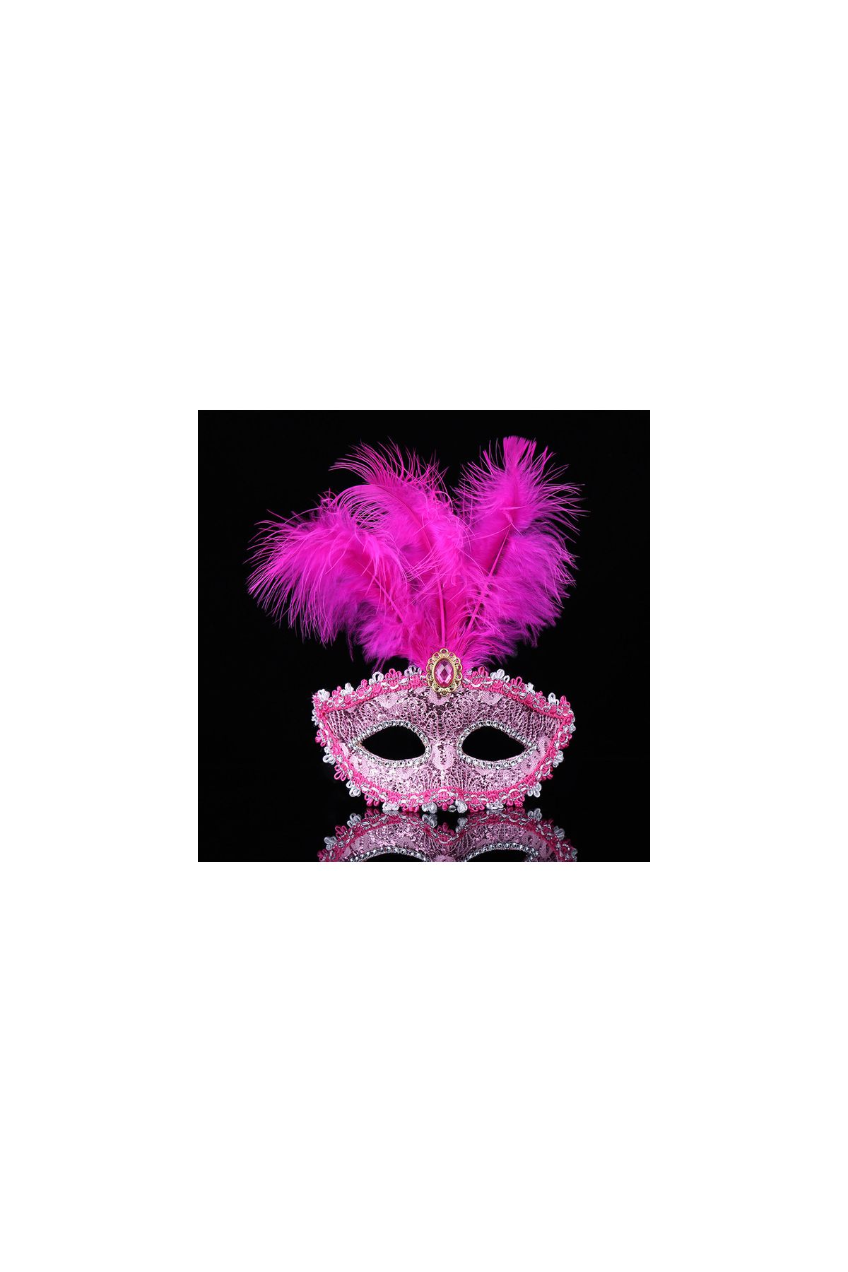 Pembe Dantel İşlemeli Pembe Tüylü Balo Parti Maskesi