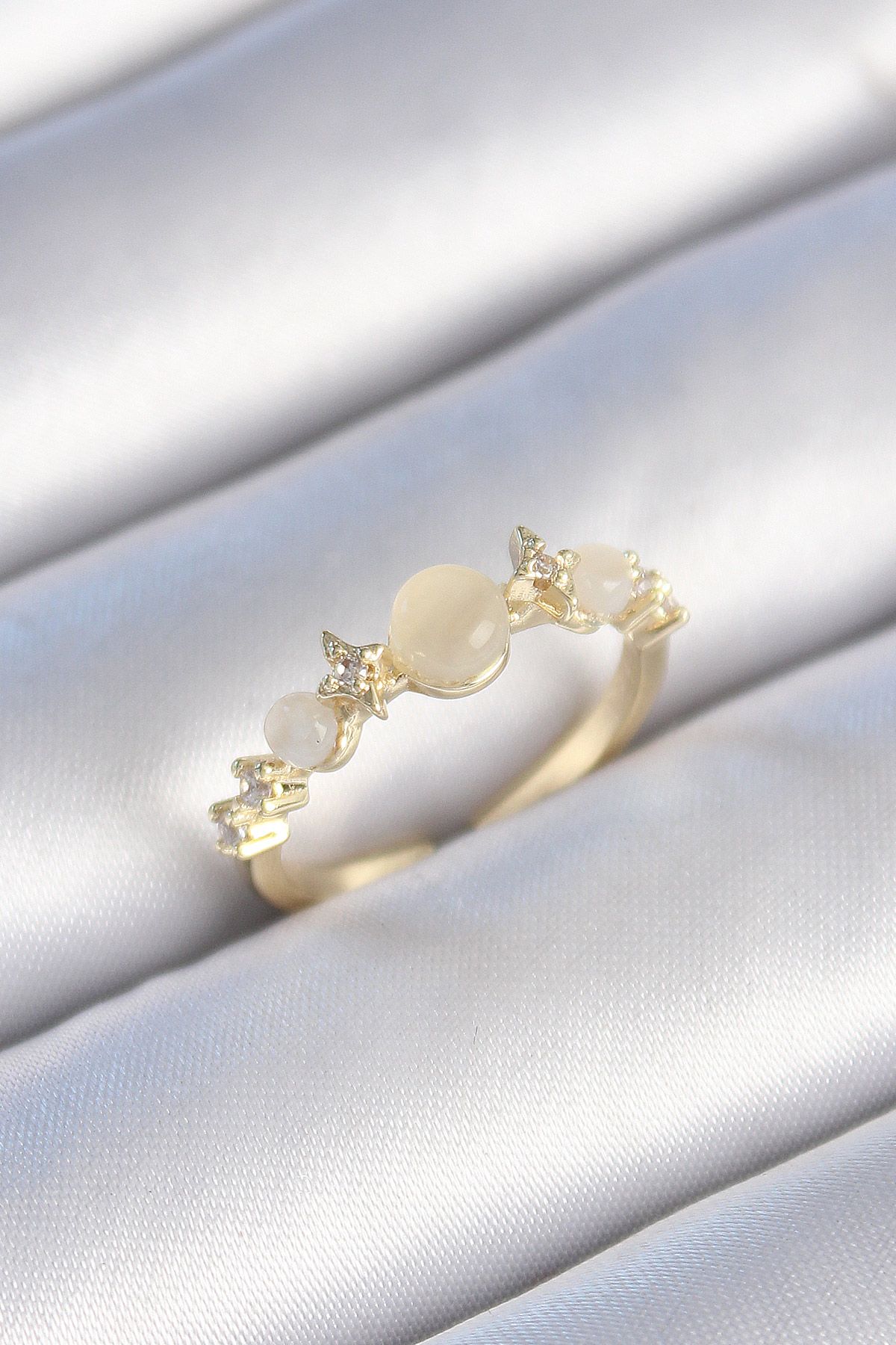 Pirinç Gold Renk Zirkon Taşlı Yıldız Detay Beyaz Mineli Kadın Yüzük - TJ-BYK3440